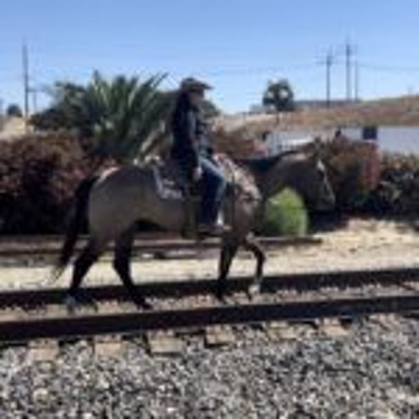 ONLINE AUCTION Place your bids at www.PlatinumEquineAuction.com Starting Bid $3500 Auction ends October 20th, 2024 Need a new saddle? Check out White Rock Saddles on our website or Facebook! This handsome boy is a 10 year old grulla gelding. Smokey stands just at 15 hands. Smokey is a horse that loves to go out on great long adventure he’s been trail ridden most his life, and isn’t phased by much of anything! Smokey will ride down some of the busiest, nosiest highways with cars and trucks streaming by him and not have a care in the world. Smokey has been rode through the water canals and enjoys crossing through all depths of water. Smokey has been rode through thick orchards all through the Central Valley, their heavy machinery doesn’t phase him one bit. In the arena, he picks up both his leads smoothly and has a light feel in the bridle. He has smooth gaits and is nicely paced. He is in the process of learning more reining maneuvers and is taking to them nicely ! Smokey is absolutely gentle and easy to get along with for most any level. Smokey is great for the farrier, he will stand quietly in cross ties. You can clip Smokey effortlessly and get all underneath him scrubbing while bathing him. Smokey will load in any trailer and stand tied all day. Call Kevin Allen 858-395-7742 with any questions. Located in Ramona, CA. ONLINE AUCTION Place your bids at www.PlatinumEquineAuction.com Starting Bid $3500 Auction ends October 20th, 2024 Need a new saddle? Check out White Rock Saddles on our website or Facebook!