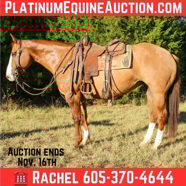 ONLINE AUCTION Place your bids at www.PlatinumEquineAuction.com Starting Bid $3500 Auction ends November 16th, 2025 Need a new saddle? Check out White Rock Saddles on our website or Facebook Henrietta is a 12 year old red dun mare, standing 15 hands tall and stout! Henrietta has been used for a little bit of everything! She has been rode on the ranch and has done all aspects of ranch work! She has been trail rode extensively, from being rode around the ranch to being hauled to trail camps and state parks she has been rode countless miles outside, she crosses the creeks, logs, bridges and goes through the brush and does anything he is asked! Henrietta has been rode by all ages and levels of riders and is suitable for any level rider. Please reach out to Rachel with TR Livestock 605-370-4644 if you have any questions! Located in Rusk, TX. ONLINE AUCTION Place your bids at www.PlatinumEquineAuction.com Starting Bid $3500 Auction ends November 16th, 2025 Need a new saddle? Check out White Rock Saddles on our website or Facebook