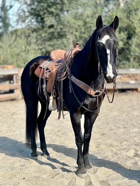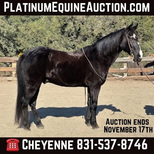 ONLINE AUCTION Place your bids at www.PlatinumEquineAuction.com Starting Bid $3500 Auction ends November 17th, 2024 Need a new saddle? Check out White Rock Saddles on our website or Facebook! Garbanzo is an 11 year old, 15HH grade black quarter horse gelding. He is a sweet heart horse that is safe for anyone able to climb on his back. Garbanzo is a great mid-paced gelding who is so fun to ride in and out of the arena. This boy has been rode all over the different country sides. Through high redwood forests, busy city streets, and steep mountain ranges he’s a saint through all of it! Garbanzo is very sure footed, knows how to place himself steadily, and aware of his surroundings. He travels through water, brush, rocks, and logs effortlessly. He’s seen wildlife, pedestrians and vehicles, nothing seems to bother him! In the arena he is smooth around the pen, neck reins softly, moves off leg pressure and has a great stop. He always keeps a nice even pace and is just a joy to ride anytime. He can be left off and not miss a beat. He will be the same horse you pull out of his pen everyday. Garbanzo has no buck, spook or bolt, making him trustworthy and dependable. He ties, bathes, and stands quietly for the farrier. Loads in any trailer without hesitation, can be stalled or pastured. Garbanzo is a fantastic, safe gentle boy for the entire family! He is a finished, sane trail horse, or also has the potential for other things, like ranch versatility, lesson programs, trail classes, etc. his possibilities are endless! For more information or to come see him for yourself please contact Cheyenne Rey 831-537-8746. He is located in Bitterwater, CA. ONLINE AUCTION Place your bids at www.PlatinumEquineAuction.com Starting Bid $3500 Auction ends November 17th, 2024 Need a new saddle? Check out White Rock Saddles on our website or Facebook!