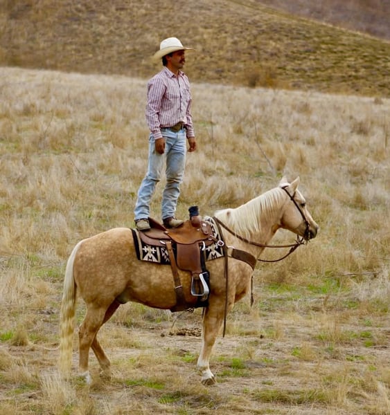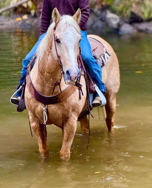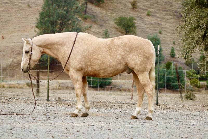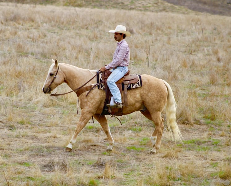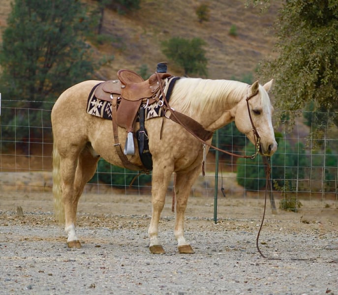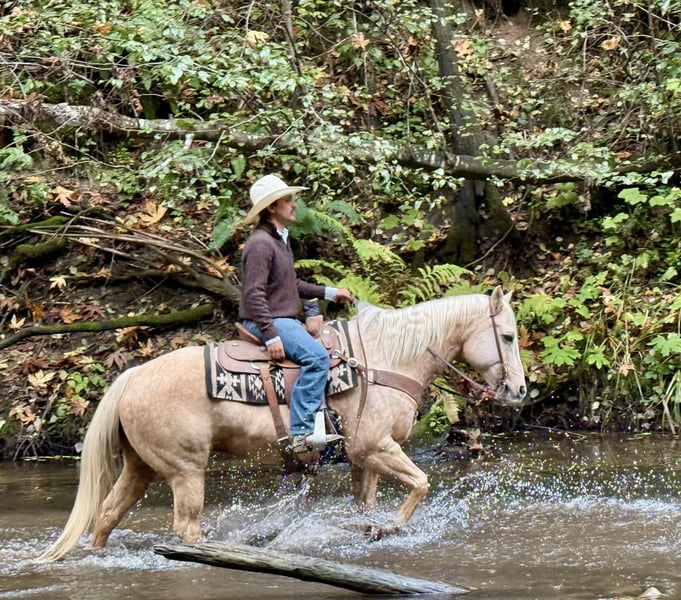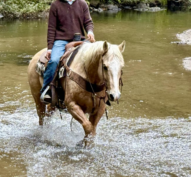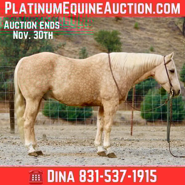 ONLINE AUCTION Place your bids at www.PlatinumEquineAuction.com Starting Bid $3500 Auction ends November 30th, 2025 Need a new saddle? Check out White Rock Saddles on our website or Facebook The Golden Kind Everyone Looks For but Rarely Finds. If you’ve been waiting for a horse that combines eye-catching beauty with real-world experience take a close look at Cash. This stunning 12-year-old, 15-hand, 1,200-pound dapple palomino gelding is the complete package: gentle, seasoned, broke, and dependable in every situation. Cash is as safe and user-friendly as they come. He’s been used extensively on the ranch for gathering, sorting, doctoring, and branding, and he handles every job with maturity and confidence. Out on the trail, he is rock solid — surefooted through steep country, steady in the trees, calm in deep water, and comfortable in rough terrain. He crosses bridges, walkovers, tires, and any obstacle you present with zero hesitation. Tarps, flags, traffic, dogs, bicycles, and busy environments don’t faze him in the slightest. In the arena, Cash shows off the kind of training that takes years to build. He lopes around smooth and collected, stays soft in the bridle, has a clean stop, easy turnaround, and a correct, uncomplicated way of going that riders of any level can appreciate. He’s the same horse every day — whether he’s been ridden all week or pulled straight from turnout. Ropers, pay attention. Cash is a finished heel horse with all the credentials. He scores quiet, leaves flat, hunts the corner, and drags his hip with confidence every run. He’s extremely easy to rope on, stays cool and correct, and has been hauled to jackpots and used in real-world ranch roping. You can head on him as well — he’s versatile, experienced, and steady in the box. Cash has the kind of foundation and seasoning that makes him suitable for riders of all levels. He’s gentle enough to teach someone new, and broke and dependable enough for a serious hand who wants a horse they can trust to get every job done right. He ties, clips, bathes, loads, hauls, stalls, or pastures with no issues and has been an absolute gentleman in every setting. Cash represents the kind of quality most people hope to find but rarely get the chance to buy. He brings looks, training, and real-world dependability together in one golden package. If you want a horse you can be proud to own from the moment you unload him, Cash is the one that stands out. Dina – Longhorn Ranch • Paicines, California (831) 537-1915 Nationwide shipping available. ONLINE AUCTION Place your bids at www.PlatinumEquineAuction.com Starting Bid $3500 Auction ends November 30th, 2025 Need a new saddle? Check out White Rock Saddles on our website or Facebook