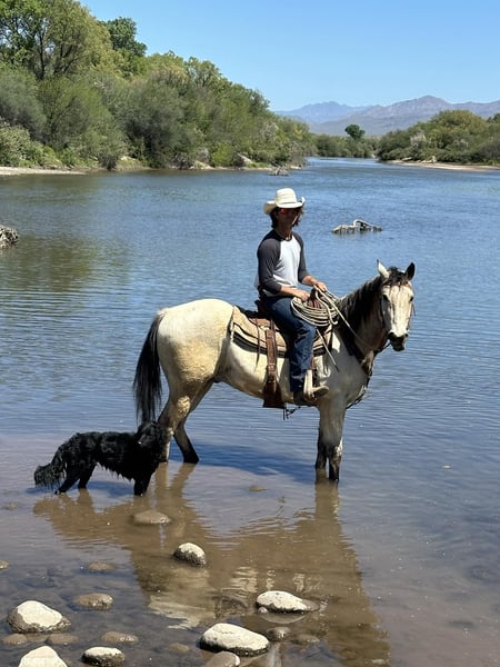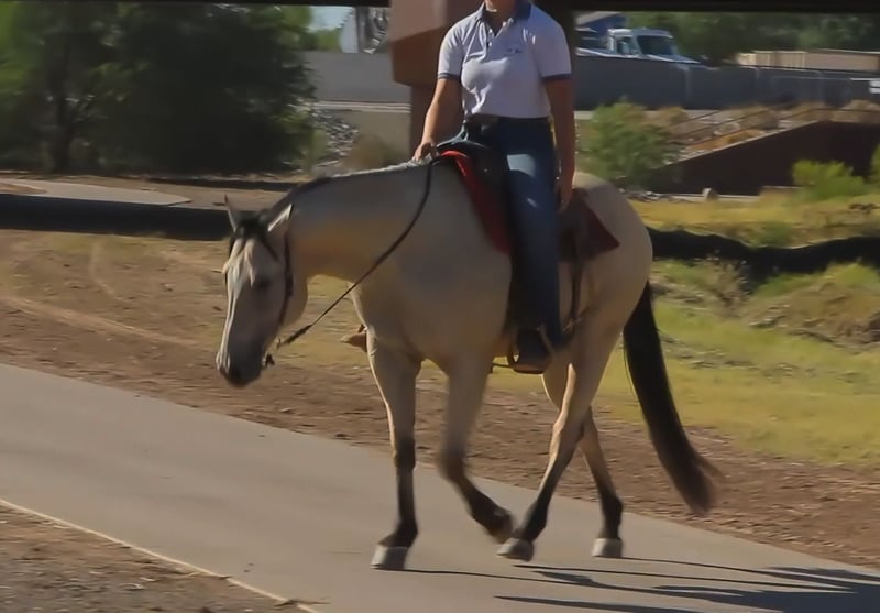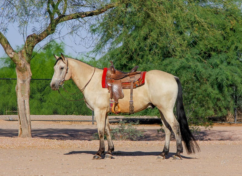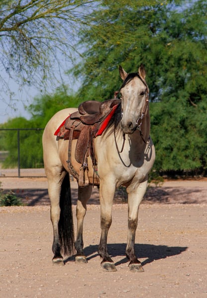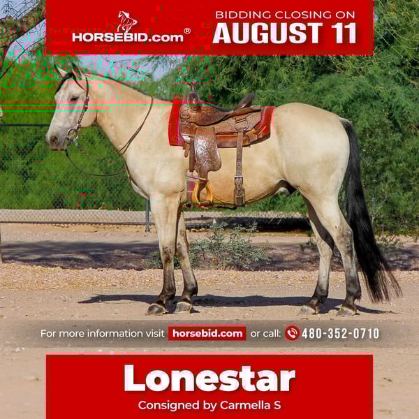 ⚜ The HERITAGE Classic ⚜ Happening now thru MONDAY | AUGUST 11th - Available EXCLUSIVELY on HorseBid's website! For more details and to register visit: www.Horsebid.com CONSIGNOR CONTACT: Carmella S 480-352-0710 LOCATION: Mesa, AZ BREED: Quarter horse REGISTERED: No REGISTERED NAME: Lonestar COLOR: Buttermilk buckskin HEIGHT: 15.1 AGE: 13 GENDER: Gelding Lonestar is a gentle 13 year old Buttermilk Buckskin Quarter Horse Gelding. He is all around quiet, gentle guy. He is built to carry any size of rider with his stocky, athletic build. He can ride out alone or in a group. You can put him with or around anything and he gets along with it from, little ponies, dogs, and other horses just great. Low man in pecking order. This sweet, gentle guy is sure to be somebody's main mount. Lonestar is in great health, he is kept up on worming, vaccinations, and recently had his teeth done. In his past, he was a finished ranch horse and worked with cattle. He has a one handed neck rein, he has a awesome lope , side passes, backs it up, and will stop on a dime . Since then, he has been a good family trail horse, you point him in the direction you want to go and he goes! He trail rides confidently through water, up and over hills, he’s got you! this guy can go all day! Set him on cruse control and ride. He has been exposed and around machinery and equipment, example, garbage trucks, tractors, forklifts, cars and etc. and handles it like a champ! He ground ties like a saint. He tacks up, trailer loads, bathes, will lower his head for you to fly mask him, and picks up his feet like butter. He stands for the farrier just as patient as can be, with no issues, couldn’t ask for more. His ground manners are great! Lonestar, is a all around a super gentle trail riding guy! He can be your main mount!!!! PPE is welcomed at buyers expense. Located in Mesa, Az You can contact at 480-352-0710.