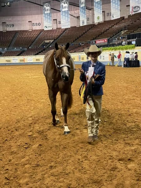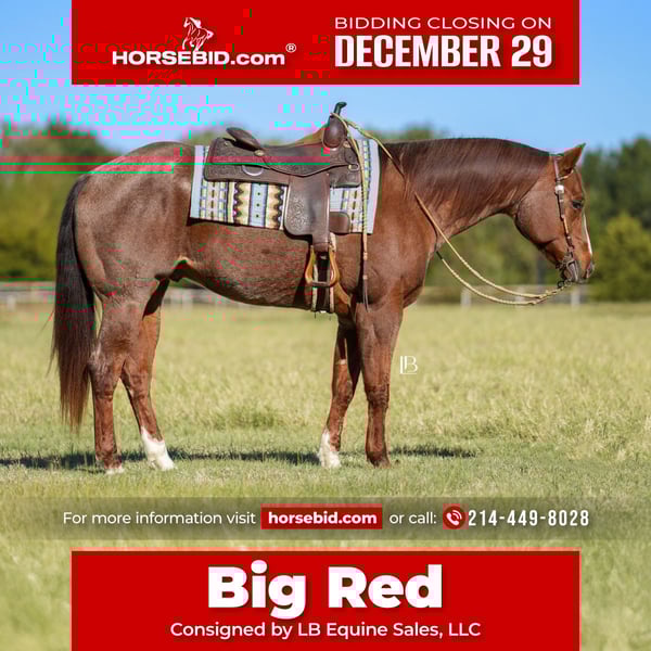 ⚜️ 𝓗𝓮𝓻𝓲𝓽𝓪𝓰𝓮 𝐖𝐢𝐧𝐭𝐞𝐫 𝓒𝓵𝓪𝓼𝓼𝓲𝓬⚜️ Happening now thru MONDAY | DECEMBER 29th - Available EXCLUSIVELY on HorseBid's website! For more details and to register visit: www.Horsebid.com CONSIGNOR CONTACT: LB Equine Sales, LLC 214-449-8028 LOCATION: Terrell, TX BREED: AQHA REGISTERED: Yes REGISTERED NAME: Redwinder COLOR: Red Roan HEIGHT: 16 AGE: 12 GENDER: Gelding Need a safe, reliable, teacher/packer type that’s YOUTH and OLD lady safe?! Big Red is the man! This gentle giant has many show miles under his belt. He went Circuit Champion in Youth Aged Geldings and Reserve Champion Open Aged Geldings at the 2021 AQHA World show with a youth rider! He has been shown at color breed congress and received 5th in All Breed Amateur W/T Ideal Ranch Riding with a youth. You will absolutely adore his kind big doe eyes, sweet loving temperament, and puppy-dog like personality. Easy – the same guy every time – with extensive miles under his belt. Get ready because Big Red will help you improve your confidence in the ring! Big Red strides out beautifully for the hunter under saddle! He goes around gorgeous across the ground with a lovely big stride that is eye catching. He would make a brilliant western dressage horse as well! He is soft in a snaffle and comes into a frame effortlessly. Side passes, knows his leads, pivots, and has a great whoa button/back up! Big Red does not require any lunging prior to riding and is the same ride whether you ride him once a month or once a week. Safe with no buck/bolt/rear. He ADORES toting around youth riders and is a straight forward kinda guy – never looking to cheat you. Suitable for any level rider, I would love to find him another youth kiddo or older person to tote around. He adjusts to his rider and knows his job when he needs to go in packer mode. He will pony other horses, and is never grumpy, he is always willing and ready for your next cue. He has an adorable friendly out-going personality, is easy to catch/tie, stands quiet as a mouse for mounting, respectful for vet/farrier etc. Crosses water, over bridges, and steps over poles out on the trail too!! With his show experience, his kind, and seasoned temperament we know he will make a great partner for any youth or adult looking for confidence in and outside the show pen! Sells with a vet report on file, 100% sound and goes BAREFOOT! Will x ray good/clean! recently dewormed, vaccinated, and teeth floated. Not currently on any maintenance as well. He is in his winter woolies, and wears a size 80 blanket when it drops below freezing. He can live a show horse lifestyle in a stall (neat in a stall) or be kicked out to the pasture with friends just fine. No known vices. Hops right in the trailer, trailers well, backs off like a gentleman. HYPP N/N per his papers. All bill of sale paperwork and AQHA papers in hand and will be signed/transferred at the conclusion of the sale. Looking for a kind and well-seasoned been there done that gelding to show in the all-around or play at home for pleasure? You’ve found your match! Shipping can be coordinated to any location.