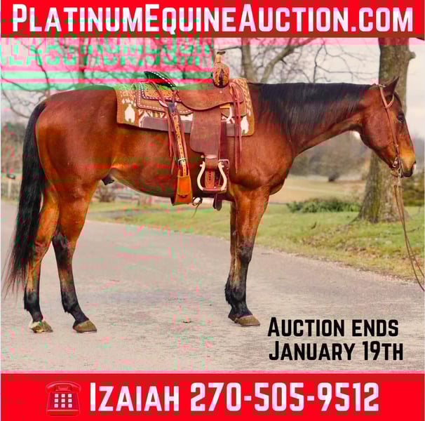 ONLINE AUCTION Place your bids at www.PlatinumEquineAuction.com Starting Bid $3500 Auction ends January 19th, 2025 Need a new saddle? Check out White Rock Saddles on our website or Facebook! 12 YEAR OLD BAY RANCH GELDING! Alan stands around 15.1 and is a blast to have around! We have used this gelding for trail riding and taking him to over night camping trips! He will cross the creeks and logs with ease and absolutely loves his job! This gelding has been rode English and Western and will take both of his leads and is a beautiful mover! Alan has a very nice neck rein and will go as fast or as slow as you wanna go! We have used him to check fence around the farm and check cattle! He will go any direction you point him! He Loads,Clips,Bathes, and will be the first one up to you in the pasture! He rides one handed and has more buttons than an airplane! He has a great stop,back up,and side pass! This gelding is ready for his new loving home and would make someone a great companion! Located in Rineyville Ky! Call Izaiah Ryan 270-505-9512. ONLINE AUCTION Place your bids at www.PlatinumEquineAuction.com Starting Bid $3500 Auction ends January 19th, 2025 Need a new saddle? Check out White Rock Saddles on our website or Facebook!