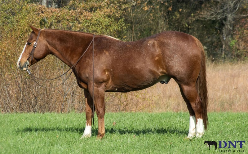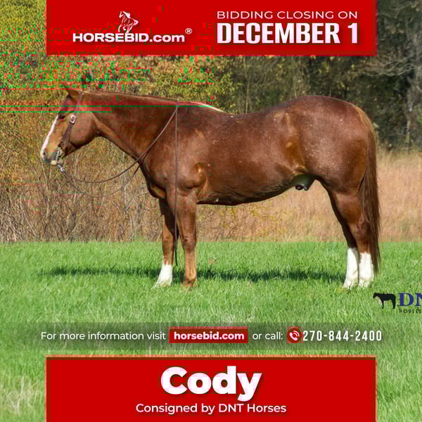 ⚜️ 𝓽𝓱𝓮 𝐇𝐨𝐫𝐬𝐞𝐦𝐚𝐧'𝐬 𝓢𝓱𝓸𝔀𝓬𝓪𝓼𝓮⚜️ Happening now thru MONDAY | DECEMBER 1st - Available EXCLUSIVELY on HorseBid's website! For more details and to register visit: www.Horsebid.com CONSIGNOR CONTACT: DNT Horses 270-844-2400 LOCATION: Henderson, KY BREED: Quarter Horse REGISTERED: No REGISTERED NAME: Cody COLOR: Chestnut Red Roan HEIGHT: 14.2 AGE: 13 GENDER: Gelding CODY WILL SELL COMPLETELY UNRESERVED TO THE HIGHEST BIDDER AT SALE TIME!!! DON’T MISS OUT ON THIS EXCEPTIONAL GELDING!!! Cody is a gorgeous 13 year old grade chestnut roan gelding. Along with his cuteness, he is the perfect height standing at 14.2 hands tall and all the shape you could want. Cody isn't just an eye catcher he is broke for any level rider. Cody will walk all day if asked. He has a nice cowboy trot to him and transitions to a nice lope. He neck reins with one hand or you can ride him two handed, responsive to leg cues, backs and stopd when asked. He is out standing on the trails and has been trail ridden extensively through many different types of terrain. He is sure footed and honest. Cody is not spooky and will cross creeks, go through any body type of water, thick brush, logs, bridges, rough terrain, up and down cliffs with ease. He has been rode on the road and is use to all kinds of traffic, heavy machinery and ATV’s. He is also dog safe. You can ride Cody out alone with ease or with other horses. He's also been used to sort and pen cattle in the fields as well as taken to local cattle sorting. Cody will stand still for you to get on him from the ground or a mounting block. He stands to be groomed, fly spray, stands still to be saddled, takes the bridle with ease, bathes good, loads like a dream, clips great, and stands for the farrier. UTD on vaccines, coggins and farrier. We invite anyone and everyone to come meet and ride Cody at our barn in Henderson, Kentucky. We are happy to assist with transportation arrangements. For any questions about Cody please contact Tasha 270-844-2400