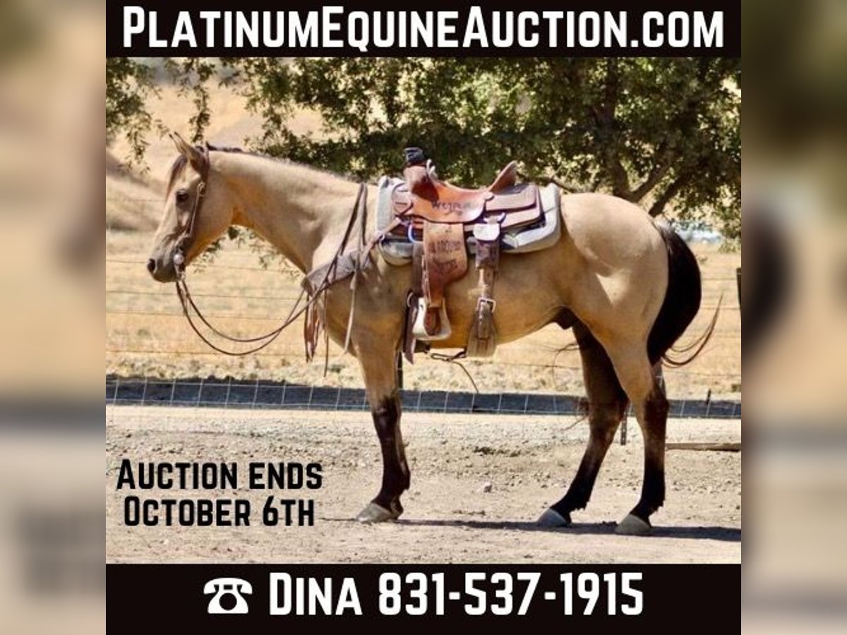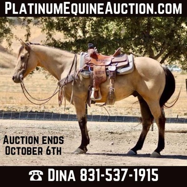 ONLINE AUCTION Place your bids at www.PlatinumEquineAuction.com Starting Bid $3500 Auction ends October 6th, 2024 Need a new saddle? Check out White Rock Saddles on our website or Facebook! Dylan is a delightful buckskin gelding who’s not just a horse but a companion! If you are looking for the perfect trail mount look no further. At 12 years old and standing at a charming 14.2 hands, he embodies everything horse lovers dream of gentle enough for anyone to ride yet possessing that spark when you want him to shine. Dylan who transitions smoothly in all his gaits and always rides collected and soft. With a subtle yield to leg pressure, Dylan rounds out beautifully while maintaining an unshakable calm around various distractions be it balls, tarps, flags, or even noisy tractors; nothing fazes this steady guy! Dylan is super in heavy traffic and has been ridden in late hours in fuel stations with lights and cars speeding by and he handled it like a champ. Whether you’re gathering cattle or doing ranch chores, Dylan is super cowey and ready for action. He’s been there with a-variety of levels on board too always be reliable and attentive in every situation they encounter together. On the trail or amidst wildlife adventures, he confidently crosses creeks and navigates downed trees without breaking a sweat; climbing mountains is just another day at the office for him! Plus: he’s as easy-going as can be during grooming sessions with the farrier clipping, tying up nicely, bathing it’s all part of his charm. Loading into trailers? A breeze! Dylan truly epitomizes what it means to be both versatile and dependable a friend’s best-kept secret in equine form. Please contact Longhorn Ranch Dina 831-537-1915 located Paicines, CA. ONLINE AUCTION Place your bids at www.PlatinumEquineAuction.com Starting Bid $3500 Auction ends October 6th, 2024 Need a new saddle? Check out White Rock Saddles on our website or Facebook!