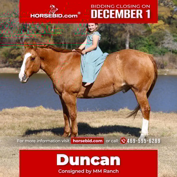 ⚜️ 𝓽𝓱𝓮 𝐇𝐨𝐫𝐬𝐞𝐦𝐚𝐧'𝐬 𝓢𝓱𝓸𝔀𝓬𝓪𝓼𝓮⚜️ Happening now thru MONDAY | DECEMBER 1st - Available EXCLUSIVELY on HorseBid's website! For more details and to register visit: www.Horsebid.com CONSIGNOR CONTACT: MM Ranch 469-595-6289 LOCATION: Forney TX BREED: Quarter Horse REGISTERED: No COLOR: Red Dun HEIGHT: 14.3 AGE: 13 GENDER: Gelding Duncan is an 13 year old stunning red Dunn ranch gelding that is safe for the whole family. No matter your age or horse experience you can ride and enjoy this amazing horse. He is a big stout made sturdy gelding that is 14.3 hands and weighs 1250 lbs. He has absolutely unmatched eye appeal that will get you noticed anywhere you go! Plenty of size, bone and foot to handle any rider and terrain! Duncan was raised on a big ranch in Montana and used daily. We bought him from an older gentleman that raised and trained him. He is a finished tried and true all around ranch horse. He’s spent his life doing a real job— roping and doctoring yearlings outside, branding calves, checking fence, and working in the feedlot. Duncan has the been there-done that mentality that makes every ride so enjoyable and stress-free. Whether you’re looking for a trustworthy partner for long days on the ranch or a gentle, seasoned horse the whole family can enjoy, this is him!! He has all the fancy buttons. Riding him is like driving a Porsche. He will pick up and go when asked but prefers a pleasant speed of a walk or his silky smooth slow jog. You can lope him off from a stand still with correct lead departure. He has slow correct spins. If you want you can turn him on like a reining horse. Soft side passes so can open and close gates on him and/or check your mail. He has controlled speed variations, will not get hyper or high strung. Duncan crosses logs, water, ditches, mud bogs, and steep banks with ease and confidence. Does not have a spooky, flighty nature, absolute no buck or bad habits, and the best part he has the most affectionate, willing-to-please attitude you will ever come across. We have never been around a horse who is so excited to see you every single day! He will always greet you at the gate and come up out of the pasture straight to his stall. We hope he finds a good loving home so someone else gets the opportunity to ride and enjoy such an amazing horse! Duncan is sound with no health issues or maintenance. He is an easy keeper. Up to date on shots, worming, feed, teeth, coggins. He is ready to go. We can and will help arrange affordable shipping if needed.