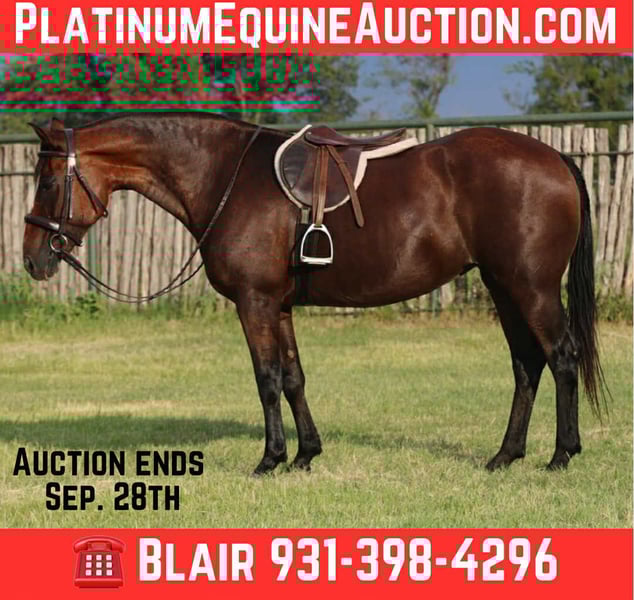 ONLINE AUCTION Place your bids at www.PlatinumEquineAuction.com Starting Bid $3500 Auction ends September 28th, 2025 Need a new saddle? Check out White Rock Saddles on our website or Facebook Stevi 13 years old, grade, stands 14.3hh tall and absolutely cute as a button. She’s the kind you can’t help but smile at every time you see her, and she’s got the temperament to match her looks. This mare has been well-loved and well-used, and it shows in the best way possible. She rides both English and Western, happily switching gears depending on what you’re wanting that day. Whether you’re looking to head down the trails, dabble in the arena, or just enjoy a relaxed hack around the pasture, she’s always ready and willing. -Safe for absolutely anyone – she’s steady, kind, and forgiving, making her an ideal partner for beginners, kids, or anyone who just wants a trustworthy horse to enjoy. – Smooth gaits – comfortable and easy to sit, you’ll find yourself relaxing in the saddle every ride. – Personality plus – she’s friendly, gentle on the ground, and loves attention. Grooming time is just as fun as riding with this girl. – All-around type – from pleasure rides to lessons, she’s versatile enough to fit into nearly any program. She’s the type you can pull out of the pasture after time off, saddle up, and ride off without a fuss. Horses like her don’t come along every day – safe, versatile, and with the cutest personality you’ll find. If you’re looking for a sweet, honest partner who will take care of you every time you swing a leg over, this 13-year-old bay mare is the one. Located in Stephenville, TX Blair Mabry 931-398-4296 ONLINE AUCTION Place your bids at www.PlatinumEquineAuction.com Starting Bid $3500 Auction ends September 28th, 2025 Need a new saddle? Check out White Rock Saddles on our website or Facebook