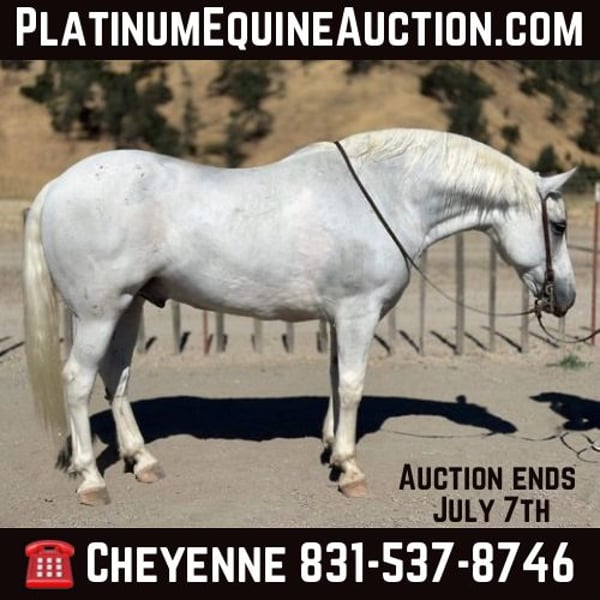 ONLINE AUCTION Place your bids at www.PlatinumEquineAuction.com Starting Bid $3500 Auction ends July 7th, 2024 Need a new saddle? Check out White Rock Saddles on our website or Facebook! Toad is a 12 year old grey and white paint cross gelding standing 15HH. This boy has the looks, brains and gentleness everyone hopes to find! Toad is a stout built boy, who is the easiest keeper. He is a friendly horse, always curious to know what you are doing. He adores attention and wants to be your best friend, you are sure to fall in love with his affectionate personality. Toad has a great mid-pace when riding out on the trails, he will coast along at any speed you desire. He’s easy to ride and never refuses. Neck rein or direct rein, he can do either. Will easily W-T-L in the arena and has a nice collected stop and reverse. We have hauled Toad to many different locations and he’s always be a complete gentleman. He has been rode over trail obstacles and through tricky terrain out in the country side. He is quiet, calm and responsive at all times. He is used to all farm animals, vehicles, and machinery. He can be left untouched for periods of time and return to riding the same horse. Toad will let you clip, bathe, and tack him up easily as he stands quiet, and patient. Toad truly is one of kind with his looks, and his personality! He is located in Bitterwater, CA. For more info contact Cheyenne Rey 831-537-8746. ONLINE AUCTION Place your bids at www.PlatinumEquineAuction.com Starting Bid $3500 Auction ends July 7th, 2024 Need a new saddle? Check out White Rock Saddles on our website or Facebook!