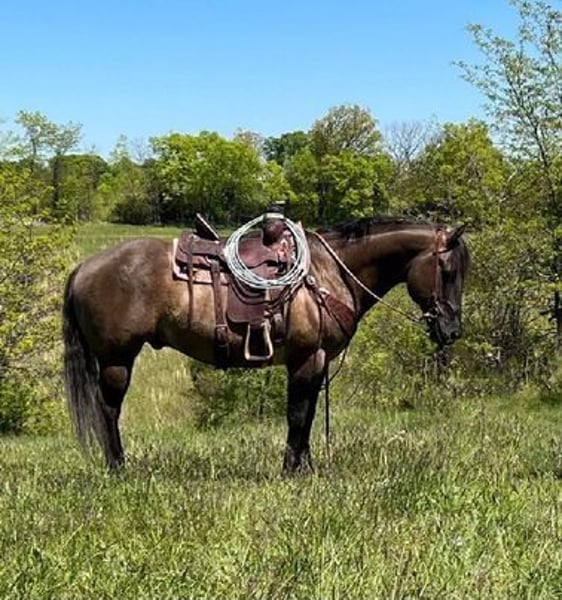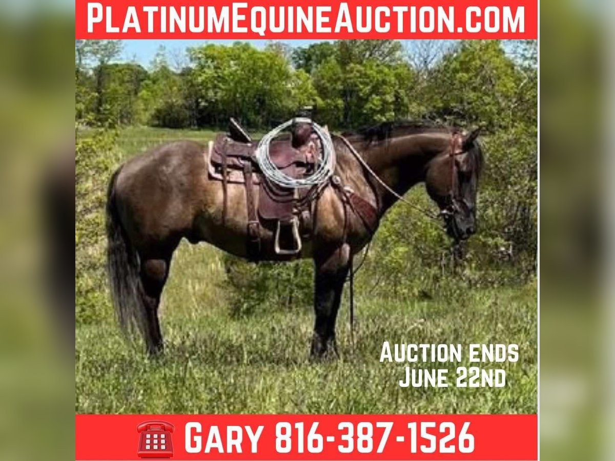 ONLINE AUCTION Place your bids at www.PlatinumEquineAuction.com Starting Bid $3500 Auction ends June 22nd, 2025 Need a new saddle? Check out White Rock Saddles on our website or Facebook! This is “DRIFTWOODSBRODYBOY”, a 15hh, 2012 AQHA registered GRULLA gelding that is a seasoned ranch horse, trail horse, and a qualified family horse. He has had reining training when younger and been used for ranch pleasure. He’s thick made and he will ride around when asked to do so, he’s been ranching in Montana and has lots of outside miles behind cattle. He has been pasture roping, used to load out trucks, and to sort pairs. He will one-hand neck rein and if asked to do so he will sit down and turn around nicely. He will slide stop, one-step lope, and catch his leads. He will lope nice circles in and out of the arena. This gelding is very gentle, he stays gentle even with time off, and he can be ridden by any level rider. He stays relaxed, calm, cool, and collected even in new and unpredictable situations. He will unload off the trailer in unfamiliar territory and ride off with no silliness. He is low-headed and rides obedient and always attentive to his riders cues. He crosses water without hesitation, he will go up and down very steep hills, and he can handle rocky and shifty terrain with no problems. He’s sure-footed and knows what to do in the rough country. He will ride out alone bravely and will also go in a group in the front or the rear. He has excellent ground manners, he’s super to work around, he likes attention, and he knows a full days work. He’s 15 hands tall and he is 13 years old. He’s attractive, shapey, has the cowboy color, the best personality, the training, and the ride to make his new owners so proud. He has been hauled to local jackpots and is ready to go to more. He is one cool horse that is user-friendly. Located in Union Star, MO. Contact Gary Osborn 816-387-1526. ONLINE AUCTION Place your bids at www.PlatinumEquineAuction.com Starting Bid $3500 Auction ends June 22nd, 2025 Need a new saddle? Check out White Rock Saddles on our website or Facebook!