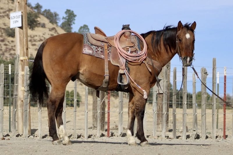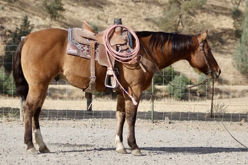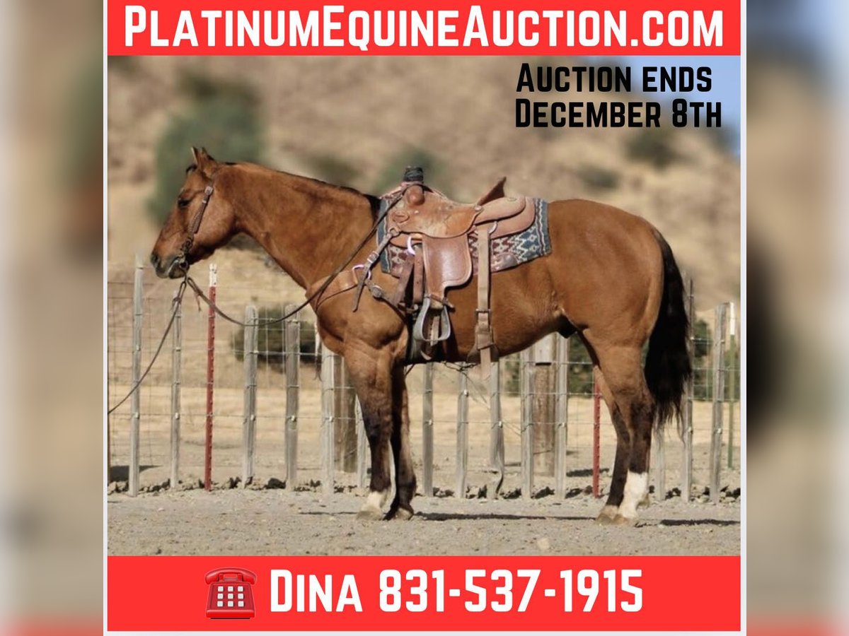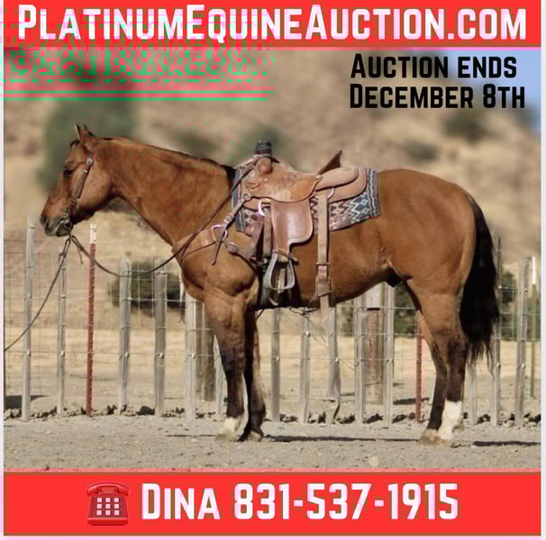 ONLINE AUCTION Place your bids at www.PlatinumEquineAuction.com Starting Bid $3500 Auction ends December 8th, 2024 Need a new saddle? Check out White Rock Saddles on our website or Facebook! Dundee is your ultimate, safe, trustworthy companion!!! At just a 12 year-old, this dun gelding standing a solid 15 hands tall with his striking tiger-striped legs that add a unique flair to his already charming demeanor. If you’ve been searching for the most safe and trustworthy horse, look no further; this gentle beauty is as quiet as a mouse and perfect for even the tiniest, timid riders. Dundee is easygoing, making him not just reliable but also an absolute joy to be around. Whether you’re gathering cattle, branding at the ranch, or embarking on scenic trail rides he navigates any trail is use to all types of wildlife , trees and thick brush. Dundee excels in every task with gentleness and confidence. He navigates varied terrains effortlessly from crossing logs to wading through deep water taking each step with unmatched sure-footedness that instills trust in every rider. In the arena, he offers smooth transitions between a slow lope and trot alongside a comfortable walk that feels like riding silk. His responsiveness shines when it comes to stopping and neck reining just a gentle touch of the reins glides him into motion without hesitation. With experience tackling obstacles such as bridges, tarps, and even car washes all completed flawlessly: Dundee demonstrates resilience under pressure while remaining unfazed by roadside traffic or playful distractions from dogs or quads buzzing nearby. This friendly boy greets you eagerly at the gate and takes everything in stride: clipping, tacking up is a breeze. Loading into trailers or settling into stalls or roaming in the pasture makes no difference to him. Dundee would be a wonderful addition to a family or make a great lesson horse with his easy gentle demeanor he would instill great confidence in beginner riders and seasoned riders alike please come meet this handsome boy and fall in love! Contact Longhorn Ranch Dina 831-537-1915 Located in Paicines, CA. ONLINE AUCTION Place your bids at www.PlatinumEquineAuction.com Starting Bid $3500 Auction ends December 8th, 2024 Need a new saddle? Check out White Rock Saddles on our website or Facebook!