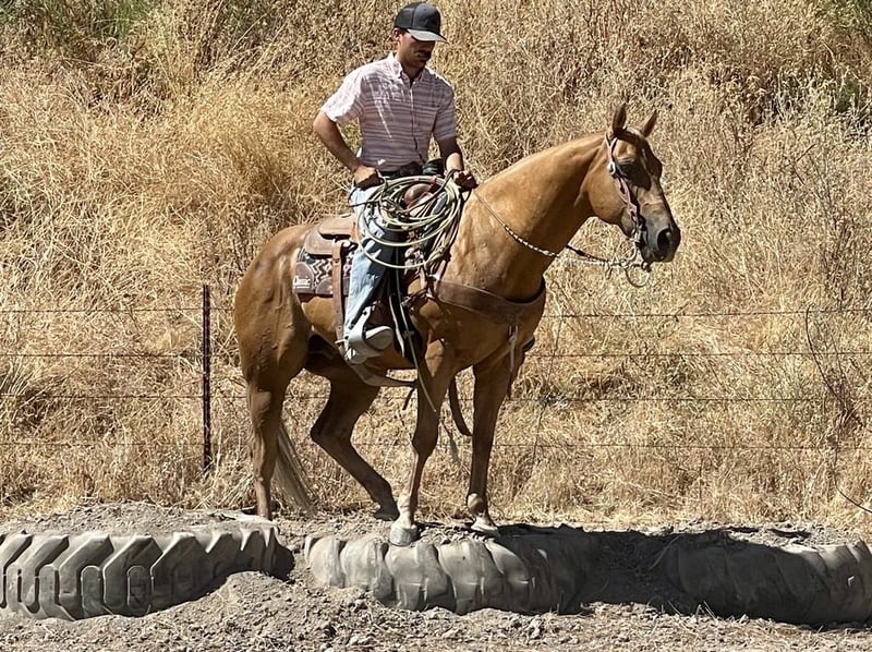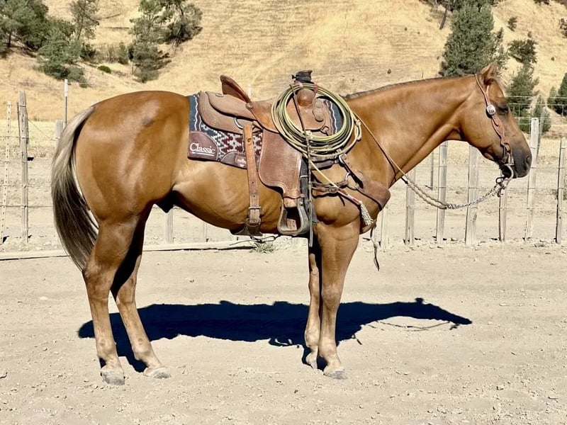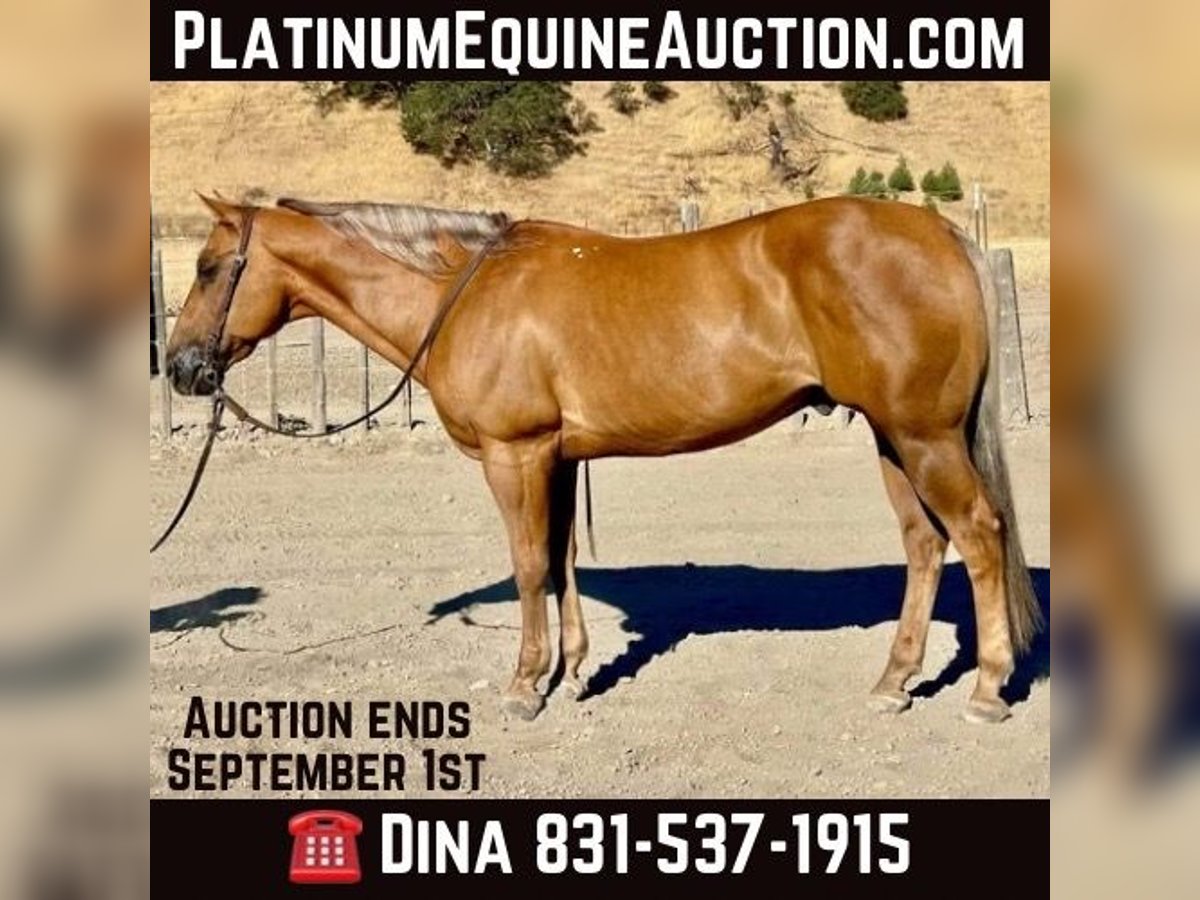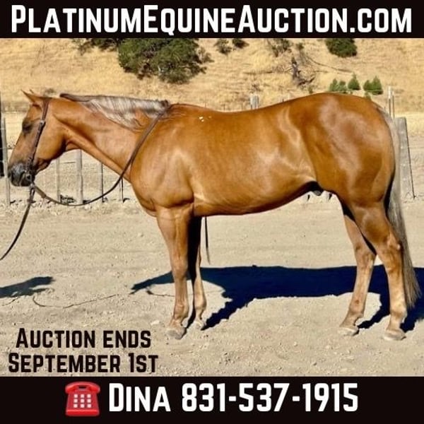 ONLINE AUCTION Place your bids at www.PlatinumEquineAuction.com Starting Bid $3500 Auction ends September 1st, 2024 Need a new saddle? Check out White Rock Saddles on our website or Facebook! Nugget is a unique colored dark palomino with silver mane and tail with a coat that shines and a heart of gold to go along with it. He stands a solid 15 hands and is 12 years old. He gets compliments everywhere we take him with his striking beauty. Nugget is built to last with his deep girth and strong hip. Nugget comes with my stamp of approval. He has the kind easy going, eager to please, disposition. He gets along with any rider and can be trusted to do his job well. Nugget is the definition of a broke horse . He walk, trots, lopes correct nice circles, big stopper and easy turnaround. Nugget has nice slow trot that is comfortable to sit, a nice comfy lope and is soft and supple in the bridle. He has been used at some ranch rodeos and has also done parades and drill. He is good out on the ranch to all the ranch duties sort, brand and doctor. He will safely pack you through any rough or rugged terrain, high water, soggy mud, or ditches. He will navigate trails with ease, going up or down steep hills over logs and through dense brush. Nugget has been exposed to all kinds of wildlife such as deer, pigs, elk and rabbits. Nugget is completely traffic safe and pays no mind to speeding cars, honking trucks, bikers or loud noises. Nugget will ride in a group setting or will go out and enjoy a scenic trail ride with his rider. He is a friendly horse meets you at the gate and loves to be groomed and is easy to handle he is patient and kind. He ties, clips, and baths and is easy to tack up. We have done trail obstacles on him and he is absolutely reliable and willing to try anything you ask of him. He has been exposed to the tarp, bouncy ball and flag he is a rockstar. Nugget is user friendly and molds to his riders ability. This boy is very versatile and will be the clam trail companion or be the competitive ranch horse he has done it all. This is an exceptional gelding that we have enjoyed having and we know he will make his new home very special. Please contact Longhorn Ranch Dina 831-537-1915 located in Paicines, CA. ONLINE AUCTION Place your bids at www.PlatinumEquineAuction.com Starting Bid $3500 Auction ends September 1st, 2024 Need a new saddle? Check out White Rock Saddles on our website or Facebook!