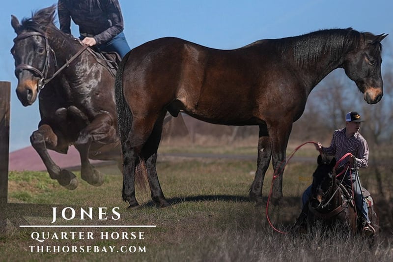 Jones is the ultimate been-there-done-that-seen-it-all-before gelding. Whether you need a seasoned, reliable horse to add to your string or you’re just starting out and need a horse that knows more than you do, Jones is the man for the job. Aside from being an expert in all aspects of ranch work, Jones is also no stranger to camping in the mountains, teaching beginner lessons, and even jumping. Jones has always gotten his riders home in one piece, no matter how rugged the terrain or how wild the moonlight trail ride was. Jones is the type of horse that, no matter the job, no matter the time off, and no matter the rider, he gets it done safely and leaves his rider feeling confident! He will be an asset to anyone who values a solid, experienced, safe horse. Jones is a 14-year-old Quarter Horse gelding standing a sturdy 15.3 hands high. He’s the perfect horse to live out your “Yellowstone” dreams on. He’s the horse you know your kids will be safe with, and never be bored with, either. Rope in the pasture one day, camp on the weekend, and take him to a 4h show and jump around the next! Want to get the husband to enjoy your equestrian lifestyle with you? Jones is the guy for the job. Go out to rope in the pasture, tie one off, go get lunch, and Jones will be standing like a statue in the same spot you left him. He is an asset on the ranch and reliable enough for the kids or guests to hop on and join in on the action. In the arena, Jones is point and shoot. He is comfortable, easy, and listens well to his rider. He doesn’t mind a rider that’s nervous, timid, or off balance; he just goes along and does his job. He will pop around fences in the ring, and on the cross-country course, and put together basic dressage tests. Under western tack, he has a great neck rein, side passes, turns around, and has a good stop. On the trails and on the ranch is where Jones has most of his miles. He has a lot of cow and is a blast to sort on. In the pasture, he has plenty of run, stout to the horn, and is our top pick when doctoring alone. He will open and close gates, carry you through deep mud, and doesn’t mind diving off into a pond in the middle to catch a cow (see video). He is the ATV of horses! Jones is safe in heavy traffic, around hounds, and just as steady riding alone as he is in a group. He will step over ditches, swim, and stand quietly as a freight train rolls by. Aside from all of Jones’ great qualities, the most important one of all is that you can leave him off one day, or six months, and you will always know you are getting the same safe, reliable mount every time you climb aboard. The sky is the limit when you climb aboard Jones. He’s perfect for the whole family to enjoy across any discipline. Jones is an easy guy to have around, who’s happy living inside or out. He gets along well in the pasture with other geldings, mares, and colts. Jones is a good boy in his stall and is polite in the barn.