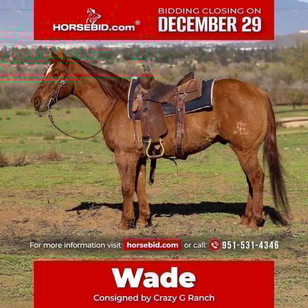 ⚜️𝐓𝐇𝐄 𝓗𝓮𝓻𝓲𝓽𝓪𝓰𝓮 𝐖𝐢𝐧𝐭𝐞𝐫 𝓒𝓵𝓪𝓼𝓼𝓲𝓬⚜️ Happening now thru MONDAY | DECEMBER 29th - Available EXCLUSIVELY on HorseBid's website! For more details and to register visit: www.Horsebid.com CONSIGNOR CONTACT: Crazy G Ranch 951-531-4346 LOCATION: Norco, CA BREED: Quarter horse REGISTERED: No REGISTERED NAME: Wade COLOR: Dunn HEIGHT: 14.3 AGE: 14 GENDER: Gelding Wade is a 14-year-old, been there done that gelding with a great mind and tons of experience. He was started as a reiner and has all the buttons a good arena horse needs.. Wade moves off the leg, rides in the bridle, will do lead changes and has a nice stop and turn around. Wade was raised and ridden on Norco trails all his life, has little to no spook and is a confident horse out on the trail. He has a more forward moving walk to him but is able to be ridden on a loose rein and not get hot or jiggy. Rides well solo or in a group setting. Wade is also a seasoned drill team horse and has been exposed to high stress environments and chaotic settings. Wade is broke, seasoned, and knows his job. He’s the kind you can saddle up and go—confident on the trail, comfortable in the arena, and suitable for riders looking for a safe, honest partner. He has a calm demeanor, good handle, and plenty of miles under his belt. If you’re looking for a versatile, experienced horse that can do a little of everything, Wade fits the bill. Wade stands quiet for grooming, saddling and for the farrier. Loads in a trailer easy and is a very personal and in your pocket horse. He stands 14.3 hands tall and is stout!