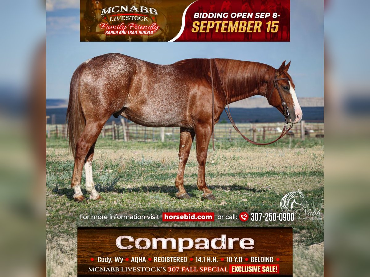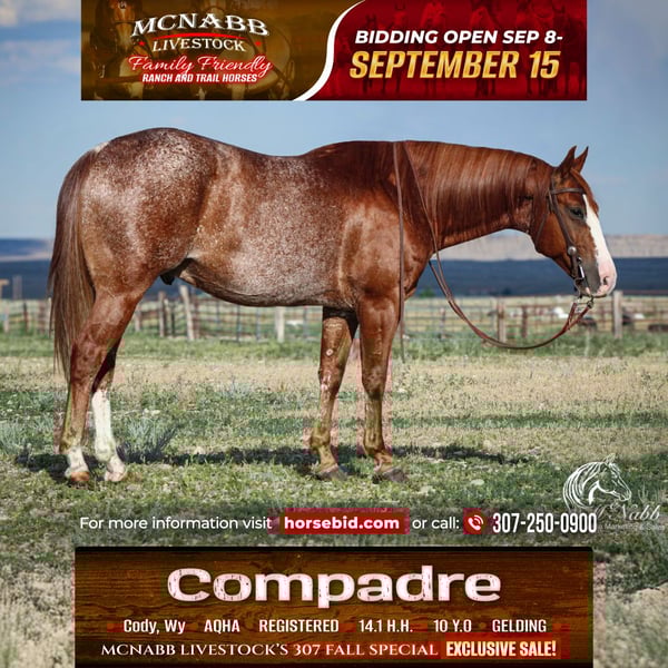 𝕄ℂℕ𝔸𝔹𝔹 𝕃𝕀𝕍𝔼𝕊𝕋𝕆ℂ𝕂's 🍂𝟑𝟎𝟕 𝐅𝐀𝐋𝐋 𝑺𝒑𝒆𝒄𝒊𝒂𝒍🍂 Happening now thru MONDAY | SEPTEMBER 15th - Available EXCLUSIVELY on HorseBid's website! For more details and to register visit: www.Horsebid.com CONSIGNOR CONTACT: McNabb Livestock LLC 307-250-0900 LOCATION: Cody, Wy BREED: AQHA REGISTERED: Yes REGISTERED NAME: RR Smooth N Smart COLOR: Sorrel HEIGHT: 14.1 AGE: 10 GENDER: Gelding Compadre is everyones friend. He is a solid broke ranch gelding. He has had many miles and hours of experience on the ranch and as a trail horse. He has an excellent handle but is very gentle and kind. He is one that fits the whole family. It doesn’t matter if you’re needing him on cold snowy day when the cows get out or you’re going out for a sunny summer trail ride he is the same horse every time. He saddles up quiet even with time off and no matter what the weather is. Compadre goes through the trail course with ease, he lopes nice circles, slow easy and low headed. He hunts a stop and has a good roll back. He is smooth to ride in all gaits. He watches a cow and is fun to ride both out on the range sorting or working in the pens, he is easy to open and close gates, excellent side pass, good one handed neck rein. Compadre has done all aspect of ranch work, he’s seasoned on the trail whether you want ranch horse for everyday work or a pretty trail horse to ride once a month he’s the one for you. He doesn’t need a daily job but he doesn’t complain if you give him one. He is happy to ride out alone or in a group. He has no vices or bad habits. He is easy to catch. He has had a basic PPE, up to date on worming, dental and farrier. We welcome you to do your own PPE and to come to the ranch a to meet Compadre. We also are glad to help arrange transportation. We will hold the horses at no charge for a reasonable amount of time to get hauling arranged. For more information call 307-250-0900.