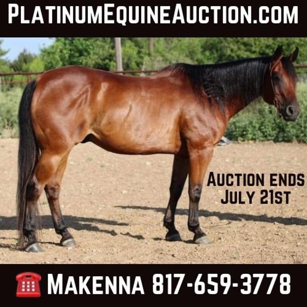 ONLINE AUCTION Place your bids at www.PlatinumEquineAuction.com Starting Bid $3500 Auction ends July 21st, 2024 Need a new saddle? Check out White Rock Saddles on our website or Facebook! Check out this amazing gelding we have had the opportunity to offer to the public, Django! At only 14 years old, this gelding is ready to find his forever family! Nothing phases this guy as he is always eager to do is job. This horse not only looks majestic, but he rides like it too. Walk, trot, lope, this horse moves like a dream. Slide into the new week knowing that you have an absolute dream of a horse that you can show off to all of your friends. Put Grandpa on him to go check cows, put your husband on him that was reluctant to buy him but is instantly going to fall in love with him or take him to the playdays and let your kids learn on him! Not only is this horse gentle, but he is TOUGH! Need to go check pasture all day? He can do it. Need to go to the long parade where he is going to have to sit all day? He can do it. Want to take the family to the lake and play in the water? Need to have something to unwind with after work? Car broke down and need to go into town to run errands? HE CAN DO IT! Whenever we have a tough hand, we know Django will always have our back. No matter how busy your life may get, Django is always ready to saddle up and ride off without a care in the world! Django will always meet you at the gate, especially with a little cookie interruption. Django also just happens to be a finished head, heel and breakaway horse! He has been hauled to many World Series ropings, rodeos and jackpots! He scores great, leaves flat and knows his job very well. Located in Stephenville TX. We can help arrange hauling anywhere in the US, Hawaii or Canada! Please call or text Makenna Hartzel 817-659-3778. ONLINE AUCTION Place your bids at www.PlatinumEquineAuction.com Starting Bid $3500 Auction ends July 21st, 2024 Need a new saddle? Check out White Rock Saddles on our website or Facebook!