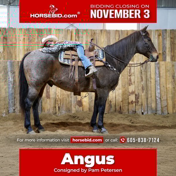 ⚜️𝐓𝐇𝐄 𝐅𝐀𝐋𝐋 𝐇𝐄𝐑𝐈𝐓𝐀𝐆𝐄 𝐂𝐋𝐀𝐒𝐒𝐈𝐂⚜️ Happening now thru MONDAY | NOVEMBER 3rd - Available EXCLUSIVELY on HorseBid's website! For more details and to register visit: www.Horsebid.com CONSIGNOR CONTACT: Pam Petersen 605-838-7124 LOCATION: Corsica SD BREED: Quarter Horse REGISTERED: No REGISTERED NAME: Angus COLOR: Bay roan HEIGHT: 15 AGE: 15 GENDER: Gelding Angus is a super broke family horse 15 years old 15 hands. Angus is a finished Family using Horse. He has been used on the ranch, used for 4-H, trail riding overnight camping trips and just leisure riding around the farm. He lopes like a rocking chair super smooth super easy to handle and ride neck reins like a dream if you’re wanting a super awesome all-around family horse that your kids can take and enjoy and mom and dad will enjoy look no further he has one heck of a nice horse that anyone would be proud to owner or ride. He is 100% sound with no blemishes. He is an easy keeper and gets along with other horses and ponies , good for farrier, he is a super nice gelding that is very sweet likes attention rides, bareback rides, double and is easy keeper with absolutely no maintenance. Call or text 605-838-7124