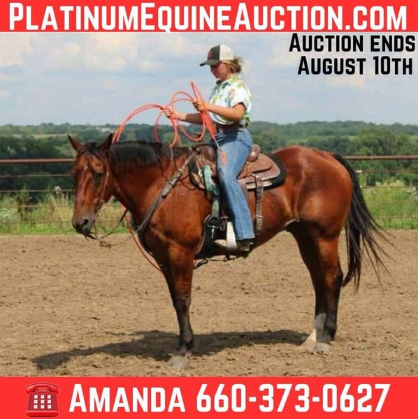 ONLINE AUCTION Place your bids at www.PlatinumEquineAuction.com Starting Bid $3500 Auction ends August 10th, 2025 Need a new saddle? Check out White Rock Saddles on our website or Facebook Meet Roscoe — the kind everyone is looking for but rarely finds! This 15.1h, 15-year-old bay gelding is a finished rope horse with a resume full of real ranch and feedlot work. He’s broke broke—soft, automatic, and rides one-handed like a dream. Whether you ride him once a year or every day, Roscoe stays the same: honest, willing, and ready to get to work. He’s the ideal teacher for someone wanting to learn to rope or work cattle, with a smooth handle, a big heart, and a no-nonsense attitude. Phenomenal on trails, quiet point and go, very honest. Safe, seasoned! Roscoe is the total package. 📍Located in Princeton, Missouri. Call or text Amanda at 660-373-0627 to come try him—you’ll be glad you did! ONLINE AUCTION Place your bids at www.PlatinumEquineAuction.com Starting Bid $3500 Auction ends August 10th, 2025 Need a new saddle? Check out White Rock Saddles on our website or Facebook