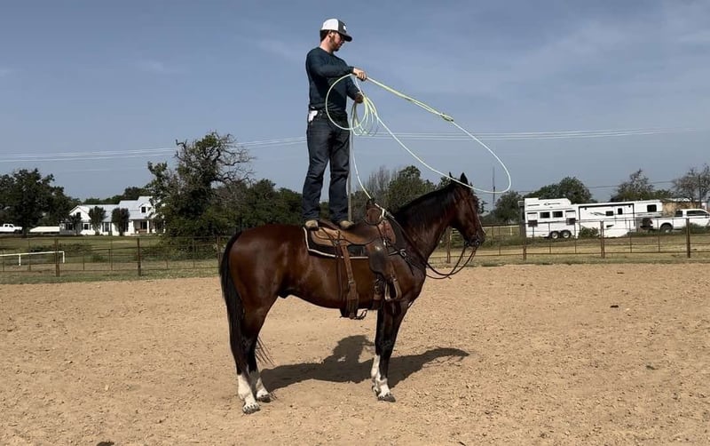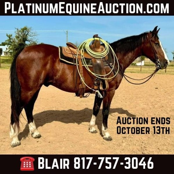 ONLINE AUCTION Place your bids at www.PlatinumEquineAuction.com Starting Bid $3500 Auction ends October 13th, 2024 Need a new saddle? Check out White Rock Saddles on our website or Facebook! Riggin is a 15.1H, 15 yr old grade bay gelding. He has been a personal switchender of ours for several years and carries our brand. Only horses that have had a profound impact on our lives get the honor to be branded in our program. He is a confidence booster for a beginner to learn how to rope on, or an absolutely safe mount anywhere for anyone! He’s one you can trust your kids on in the roping pen to the pasture! Broke broke broke with a really nice handle. Please give us a call for more info, it would simply take too long to type about how good this gelding is. He is everything you want in a confidence booster, first rope horse, old lady trail horse, kid lesson horse, or ranch horse. Riggin’ will give you a mile when you ask for an inch. He was born to please and will absolutely not step out of line. He is very very special to us and we wouldn’t mind holding him until our son can ride solo, but that wouldn’t be fair to the person that needs one like him today. Riggin is extremely comfortable at all gaits and has the very comfy rocking chair lope. He’d be the perfect horse for a beginner roper on either side. He’s 100% calm cool and collected in the box and puts you exactly where you need to be on both sides! You don’t have to rope on this horse to enjoy him though! He is a solid, sane citizen and anyone will stay safe on his back! He’s seen everything there is to see and takes to town, cars, bikes etc great! We’ve taken him multiple times to the stockyards to enjoy a cold beer on a Saturday night. Riggin is the old ranch horse everyone is asking for but no one can find because few too many like him ever come available! He’s UTD on all things and is ready to go! More pics and videos, including roping footage will be on his website page at northtexashorsecompany.com/riggin and the video of him at home was his first ride in MONTHS! This gelding is the same horse every single ride and doesn’t need “refreshed” after months off! ZERO buck, bolt, rear or bad habits. This guy will take care of anyone!! Please call Blair with North Texas Horse Company for more info at 817-757-3046. We are located in Weatherford, TX and can help arrange affordable shipping to anyone!! ONLINE AUCTION Place your bids at www.PlatinumEquineAuction.com Starting Bid $3500 Auction ends October 13th, 2024 Need a new saddle? Check out White Rock Saddles on our website or Facebook!