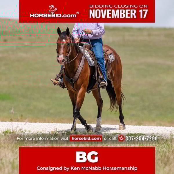 🎲𝓽𝓱𝓮 𝐑𝐈𝐃𝐄𝐑'𝐒 𝓒𝓱𝓸𝓲𝓬𝓮🎲 Happening now thru MONDAY | NOVEMBER 17th - Available EXCLUSIVELY on HorseBid's website! For more details and to register visit: www.Horsebid.com CONSIGNOR CONTACT: Ken McNabb Horsemanship 307-254-7260 LOCATION: Statesville, NC BREED: Quarter Horse REGISTERED: No COLOR: Bay HEIGHT: 16 AGE: 16 GENDER: Gelding BG is a 16-hand bay gelding weighing 1,250 lbs — and he’s one of those rare horses that everyone instantly loves. Stunning bay color and kind in nature, he’s as gentle and trustworthy as they come. Whether it’s a 6'4" adult or a 4'4" child on his back, BG takes care of his rider every single time. He spent this past summer as a guest horse in the Laramie Mountains for Trail Rider University, where riders of all experience levels praised his calm, dependable demeanor. BG was solid as a rock when loaned to a novice rider for both a three-day and three-week clinic, as well as for an all-day trail ride — earning rave reviews from everyone who rode him. I have ridden BG across the Bighorn Mountains of Wyoming and the Blue Ridge Mountains of Virginia, he has always been faultless! BG has also worked cattle and handled every new experience with quiet confidence. You will be hard pressed to show him something he hasn't seen. But if you do, you can and will have confidence that he will handle it all in stride. He moves his shoulders off your leg, has a nice collected backup, and side passes easily to open and close gates. On the ground, he’s just as reliable — stands like a statue to be tacked, mounted, or bathed, and is excellent for the farrier. From ages 3 to 73, everyone who’s swung a leg over BG has praised him. He’s a true confidence builder — the kind of horse we all wish we had a truckload of. Don’t miss this one-of-a-kind gelding! BG is up to date on shots and Coggins, PPE welcome at buyers expense. Ridden by: Donald Archer 📞 Contact: Ken McNabb | 307-254-7260