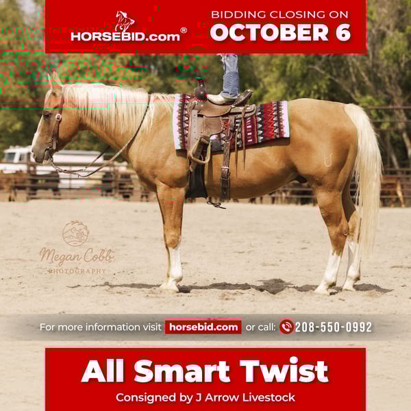 🍂 𝓐𝓾𝓽𝓾𝓶𝓷 𝑨𝑳𝑳 𝑺𝑻𝑨𝑹 𝑳𝑰𝑵𝑬𝑼𝑷 🍂 Happening now thru MONDAY | OCTOBER 6th - Available EXCLUSIVELY on HorseBid's website! For more details and to register visit: www.Horsebid.com CONSIGNOR CONTACT: J Arrow Livestock 208-550-0992 LOCATION: Caldwell Idaho BREED: Aqha REGISTERED: Yes REGISTERED NAME: All smart twist COLOR: Palomino HEIGHT: 15 AGE: 18 GENDER: Gelding Hollywood is a kids horse deluxe. He’s a money winning show horse in cow horse events and in the reigning. He’s also been roped on and been on lots of trail rides. He’s BROKE everyday. He will teach a young one how to ride and show. They don’t come better trained than Hollywood. He’s good with other horses or in the stall. Hollywood has no vices whatsoever. He deserves a great home, with a family that will enjoy him like we have. Please call fmi 208-550-0992.