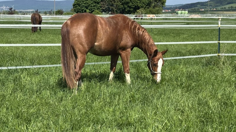 Sorrel con 4x bianco! Liroy è un puledro di un anno super bello e perfettamente costruito. Un eccellente partner per lo sport e il tempo libero con molto potenziale. Ha movimenti molto belli e un'ottima struttura. Di tipo Quarter Horse antico. Ha una genealogia molto interessante e antica. Padre Ricochet Rooster, Gallo del Cielo E madre una Shine N Mister, Shining Spark, Smart Little Lena madre! Iscritto alla NRHA Germania Su richiesta EWU