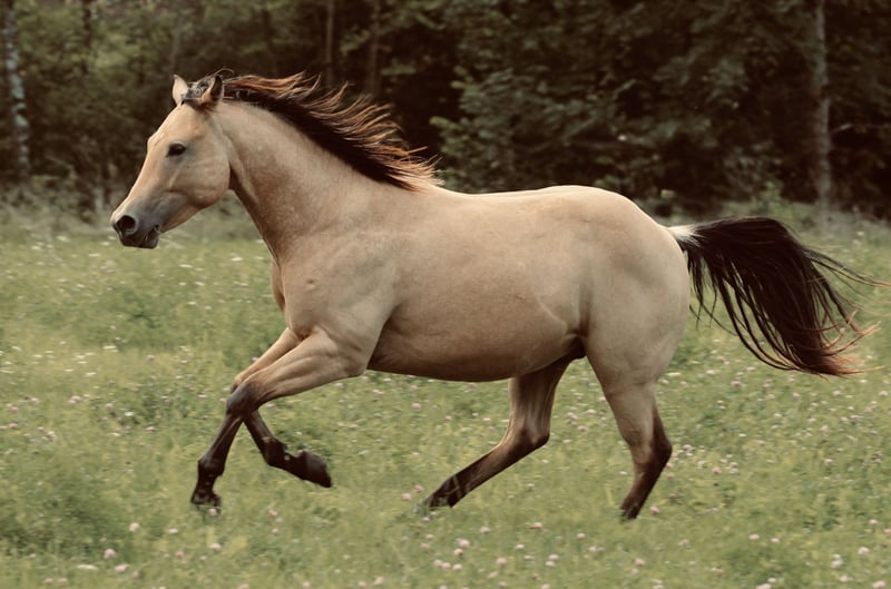 Vieux, très robuste et compact, un quarter horse bai à la robe buckskin, entier