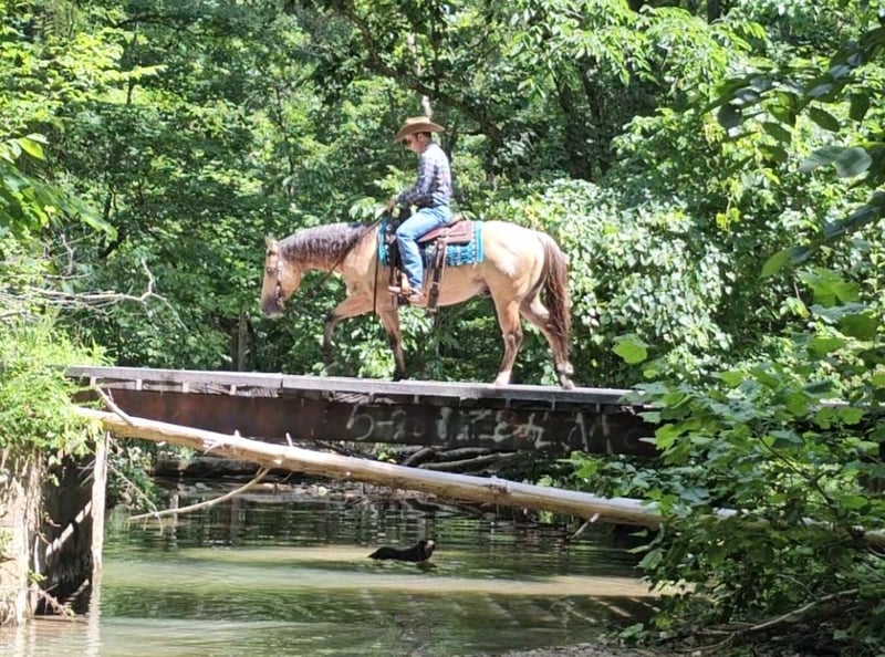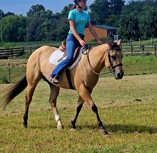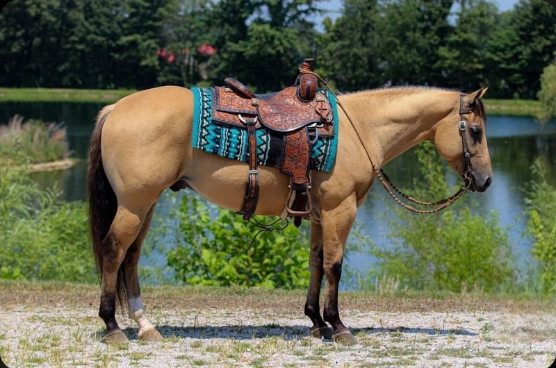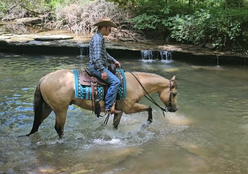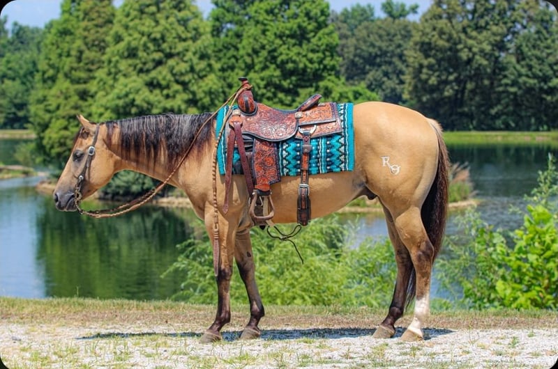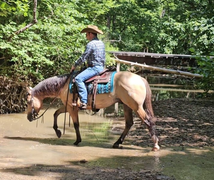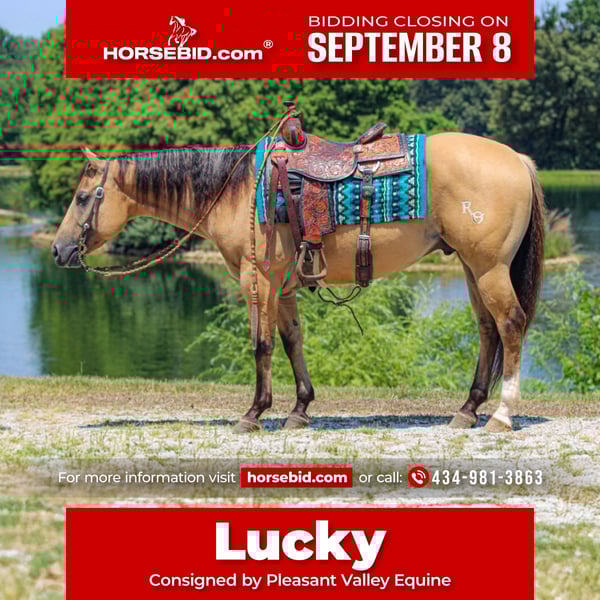 ♦️ 𝐭𝐡𝐞 𝐒𝐞𝐩𝐭𝐞𝐦𝐛𝐞𝐫 𝑺𝒆𝒍𝒆𝒄𝒕 ♦️ Happening now thru MONDAY | SEPTEMBER 8th - Available EXCLUSIVELY on HorseBid's website! For more details and to register visit: www.Horsebid.com CONSIGNOR CONTACT: Pleasant Valley Equine 434-981-3863 LOCATION: Robards, KY BREED: QH REGISTERED: Yes REGISTERED NAME: RO Lucky Faded Genes COLOR: Buckskin HEIGHT: 14.3 AGE: 3 GENDER: Gelding RO Lucky faded genes aka Lucky. Is a beautiful three year old buckskin gelding! With all the talent in the world and has the mindset of a ten year old. This is the gelding that will truly last you a lifetime with stunning looks, great disposition, and rideability. Lucky is willing to do anything you ask him to. Lucky is a very elegant mover with a butter soft trot. and a lope that is smoother than your grandmothers Lincoln town car. He has excellent lead departures, from walk to lope. He sides passes and works gates like a pro. Lucky has ponyed multiple two year olds rode fences, checked cattle, and has been on overnight camping trips ties to the picket line and carried saddle bags for many miles. Lucky has been through a major desensitizing program, and he's great with traps, bullwhips, guns, traffic, and farm equipment. He has also been over the obstacle course. Lucky is an excellent trial horse. He will cross every creek you point him at, taking each step with precision. He will ride in big groups or alone. The front or the rear with perfection. Lucky is suitable for any level rider. He has impeccable ground manners and loads in and out of any kind of trailer. Lucky stands perfectly for the farrier, clipping and bathing. Lucky also has AQHA royalty bloodlines his sire Dun Faded My Genes was a multiple AQHA world champion rope horse with two ROM'S. Do not miss this chance to own a once in a lifetime gelding with the blood lines of the Great Hollywood Dun It. Lucky sells 100% sound, sane, safe, and up to date on all vaccines. Bid with confidence. Call today for more information. 434-981-3863