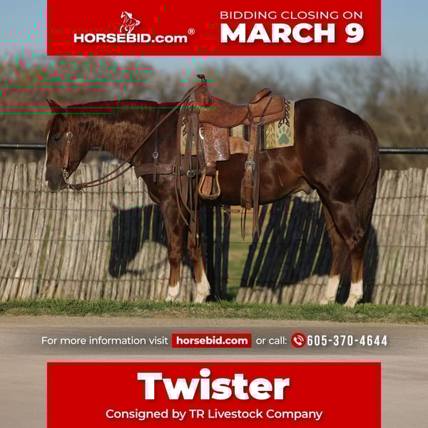 ℳ𝒶𝓇𝒸𝒽 ♦️𝐑𝐈𝐃𝐄𝐑'𝐒 𝐂𝐇𝐎𝐈𝐂𝐄♦️ Happening now thru MONDAY | MARCH 9th - Available EXCLUSIVELY on HorseBid's website! For more details and to register visit: www.Horsebid.com CONSIGNOR CONTACT: TR Livestock Company 605-370-4644 LOCATION: Rusk Texas BREED: AQHA REGISTERED: Yes REGISTERED NAME: Twistin inferno COLOR: Sorrel HEIGHT: 15 hands AGE: 3 GENDER: Gelding Twistin Inferno AKA Twister, a 3 year old AQHA sorrel gelding sired by Inferno Sixty Six (LTE of over $220k)! Twister stands 15 hands tall and is stout! He is clean, straight and correct in every! Twister starter his career under saddle with a reining foundation, he has a nice stop, solid start on spins. He trots and lopes beautiful circles, with a low headset and always soft and willing! He’s smooth, balanced, and honest, with the kind of feel that makes him enjoyable to ride whether you’re polishing things up or just going for a relaxing ride. Twister is definitely standout gelding with the pedigree, mind, and train ability that’s getting harder and harder to come by. He wants to do his job right and takes pride in it, giving you the same try every time you swing a leg over. Twister is very gentle and quiet and is a gentleman on his back or on the ground, he has a in your pocket personality and wants to be your bet friend while still being respectful! He’s excellent to bathe, shoe, tie, and trailer. Out on trails he’s a pleasure to ride, quiet, and steady. He’s good with traffic and all the everyday sights and sounds, taking everything in stride. He’s not just a talented horse with a great pedigree, he is one you look forward to riding every single day. Horses like him don’t come along often, and when they do, they’re usually the ones that stay forever. If you’re looking for a kind, versatile, gelding with an exceptional mind, that can go absolutely any direction be sure to check him out! 📍Twister is located in Rusk Texas, nationwide shipping is available! 🐴PPE’s welcomed at buyers expense! ☎️Please call Rachel with any questions! 605-370-4644