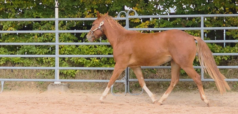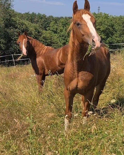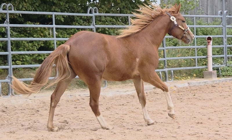 HES A RUF SHINER aka "Arkadi" am 24.03.2023 wurde der kleine fuchsfarbene Hengst geboren Wie seine Halbbrüder hat er leicht flachse Mähne und Schweif und trägt das Rabicano Gen in der Form eines kleinen Herzens auf der rechten Seite.. das ist wirklich aussergewöhnlich Sein Papa One Shiney Treat ist direkter Sohn von Shining Spark SIRE : Shining Spark ($ 10.6 Million Sire) DAM: Hagandaz (LTE $49,289 in NCHA & NRCHA, OE $65.616 in NRHA, NCHA& NRCHA) (Grays Starlight x Doc O Lena) Seine Mutter Sailin Jumping Joana Tochter von Sailin Ruf SIRE Sailin Ruf - LiL RUF PEPPY 3 Million Dollar Sire Peppy San Badger AQHA & NCHA Hall of Fame (2008) aus einer etwas unbekannteren Mutterlinie die auf DOC LYNX (NCHA LTE: $4,716,808.10) gezogen ist ⭐️ 6 Panel: N/N Seine Halbbrüder von Smartest Little Cat waren herausragend und als Fohlen von der DQHA mit 1A prämiert. Arkadi hat ein selbstbewusstes freches Wesen. Er ist neugierig und tempramentvoll und selbstbewusst und er zeigt jetzt schon sein enormes Bewegungs Potential, Ist schnell und ausbalanciert. und ein schönes kräftiges und korrektes Fundament und er ist sehr harmonisch bemuskelt. so wie er derzeit gewachsen ist vermuten wir das es größer als 150 wird. vermutlich ~153cm Hier auf Hof Eichelbrunn wächst er in unserer BubenGruppe auf. Dort seigt er sich als sehr selbstbewusst aber respektiert auch die Ansage der Älteren. Beim einem Hoftermin haben die One Shiney Treat Nachkommen sehr überzeugt und es gab für alle 3 vorgestellten eine 1A Bewertung zwischen 80,41 und 85,34... das spricht für sich und für die Qualität der Nachzucht von diesem tollen Shining Spark Sohn. Er kann jederzeit mit Papieren COR und deutschem DQHA Equidenpass ausziehen. wie alle unsere jungen Perde Tetanus geimpft und regelmässige Hufbearbeitung. DQHA Futurity einbezahlt. Ein vielversprechendes Nachwuchs Pferde für den ambitionierten Sport und Freizeitreiter! Seit dem 24.03.2025 ist Arkadi nun glücklicher Wallach. und natürlich freut er sich seine Sachen zu packen und neuen Aufgaben entgegenzugehen. Besuche sind nach Absprache jederzeit möglich