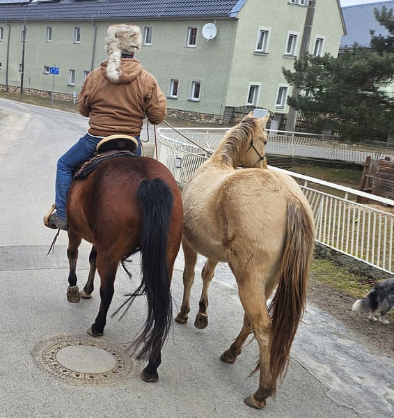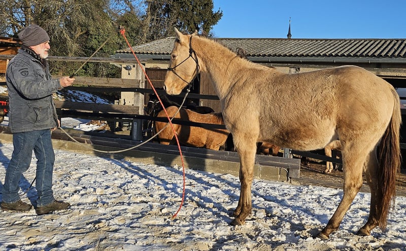 Ivo is an expressive young stallion who has been curious since day one. It will become a very reliable partner for life for the ambitious recreational or tournament rider. He is carefully prepared by us for his future life with the methods of Natural Horsemanship. He enjoys his life in open stables on a large pasture in a mixed herd. On our page http://pferdezucht-maxen.de/Ivo-Dunit-Maxen/ under the button "Training protocol" you will find the current training status.