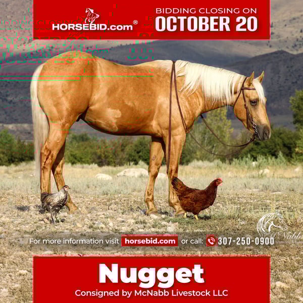 ♦️ 𝐭𝐡𝐞 𝐀𝐌𝐄𝐑𝐈𝐂𝐀𝐍 𝓕𝓪𝓵𝓵 𝓒𝓵𝓪𝓼𝓼𝓲𝓬 ♦️ Happening now thru MONDAY | OCTOBER 20th - Available EXCLUSIVELY on HorseBid's website! For more details and to register visit: www.Horsebid.com CONSIGNOR CONTACT: McNabb Livestock LLC 307-250-0900 LOCATION: Cody, WY BREED: AQHA REGISTERED: Yes REGISTERED NAME: Chex My Effort COLOR: Palomino HEIGHT: 15 AGE: 2 GENDER: Gelding Nugget is a super nice young gelding. We purchased him this spring from a neighbor who was forced to sell her last 3 horses only due to her health. She had purchased Nugget as a weanling from the breeder. She has handled him extensively, done all of the ground work since then and she started him riding. She did an excellent job with him and he has such a great foundation. We turned him out to pasture for the past 3 months. He is friendly and easy to catch, we just went out jumped on him bareback and rode him back to the barn. Nugget has a super easy going, laid back disposition and has so much potential to go any direction you'd like. We have trail rode him in the mountains, gathered cattle and have him going over the trail obstacles. He is also coming along very nicely with his area work. Nugget is correct made, well balanced, cute headed with a kind, soft eye. PPEs welcome. For more information call 307-250-0900.