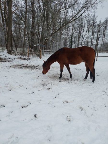 CC Electric Highlight ist ein bildhübscher Quarter Horse Wallach, geboren am 07.04.2023. Er ist bayfarben und wird voraussichtlich ein Endmaß von etwa 153 cm erreichen. Als 1a Prämienfohlen überzeugt er durch sein sehr korrektes Gebäude, seine kräftige Bemuskelung und äußerst vielversprechende Proportionen. Der Wallach ist rundum gesund und genetisch getestet (5-Panel, PSSM 2 sowie IMM n/n). Er wächst artgerecht im Herdenverband mit Gleichaltrigen auf und kennt sowohl Tierarzt als auch Hufschmied. Er ist regelmäßig geimpft und entwurmt. CC Electric Highlight besitzt einen ausgesprochen lieben und menschenbezogenen Charakter. Er zeigt sich aufgeschlossen, nervenstark und brav im täglichen Umgang. Durch seine Lernwilligkeit und seine tägliche Handhabung ist er gut vorbereitet und kennt das komplette Fohlen-ABC, inklusive sicherem Halfterführen. Wäre jetzt bereit in die Ausbildung zu gehen. Er zeigt gute, korrekte Bewegungen und stammt aus einer erstklassigen Reining- und Cutting-Abstammung (Jacs Electric Spark x High Brow Cat). Damit verspricht er, ein äußerst interessantes und hochwertiges Prospekt für den Showeinsatz zu werden.