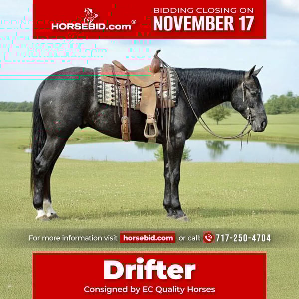 🎲𝓽𝓱𝓮 𝐑𝐈𝐃𝐄𝐑'𝐒 𝓒𝓱𝓸𝓲𝓬𝓮🎲 Happening now thru MONDAY | NOVEMBER 17th - Available EXCLUSIVELY on HorseBid's website! For more details and to register visit: www.Horsebid.com CONSIGNOR CONTACT: EC Quality Horses Carley 717-250-4704 LOCATION: Beaver Springs, Pa BREED: Quarter Horse REGISTERED: Yes REGISTERED NAME: SHY GRAY WHIZ COLOR: Dark Dappled Gray HEIGHT: 16 AGE: 3 GENDER: Gelding “SHY GRAY WHIZ” aka Drifter is a 2022 model (3yr old) Gray Gelding. Drifter stands approximately 16hh tall built exactly the way one should be! He’s solid and correct, you couldn’t ask for a better confirmation. He’s slick in the coat and good made! Drifter is one made to last! Here is a gelding that is ready for any type of discipline. He’s started correct in every way! He has a great set of bloodiness and rides up to par with his breeding. Drifter has all the brains and athleticism to go in any direction! Whether you want to do the ranch pleasure, reining, sorting/penning, roping, barrels, even the english equitation, or just a trail horse, Drifter is ready for all types of task! He rides phenomenal in the arena. Drifter will walk, trot, extend trot, canter, and slow lope! He is soft in the bridle, frames up, and moves off of leg pressure. Drifter pivots around smooth and easy. He has a one hand neck rein, back up, and side pass! He picks up both of his leads correctly, he transitions into the perfect lead change with no hesitation! He is easy to ride! We have taken Drifter out on the trails. He is easy going. Drifter crosses over logs and will go through water. He is the type you can point and go! Drifter has the best mind out of any 3yr old i’ve ever been around! He has the best disposition! He is gentle, gentle, gentle! Drifter is in your pocket with the absolute sweetest personality! He is one you will love having in your barn! He can sit with lots of time off and come out and ride off like he has been ridden everyday. He stands great for the farrier and vet! He absolutely loves being groomed and bathed! He stands to get saddled, unsaddled, mounted, and dismounted from! He loads and unloads on and off the trailer! Drifter is just the kind everyone wants and i promise you will not find another horse of his caliber that will please you as much as he will! Drifter is seeking his next new home! He is 100% Sound. A PPE is welcome at the buyers expense. He will come with a current coggins and health certificate after purchase! For further information regarding Drifter please don’t hesitate to reach out to Carley @ 717-250-4704