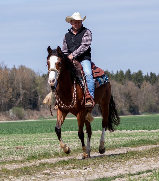 We are offering our beloved American Quarter Horse gelding, "Johnny," born in 2023, in the stunning color "Bay." This young gelding impresses with his promising pedigree and exceptional talent in the reining discipline. He has been backed and demonstrates a strong willingness to learn, along with a solid foundation in basic training. With his correct conformation and elegant appearance, he is truly a head-turner. A horse with great potential that still needs further development and support. Johnny was born here and raised in a large herd. He is familiar with the lively life on a horse farm, including tractors, cattle, and children. Please contact us by phone only at 0172/9084423 for inquiries.