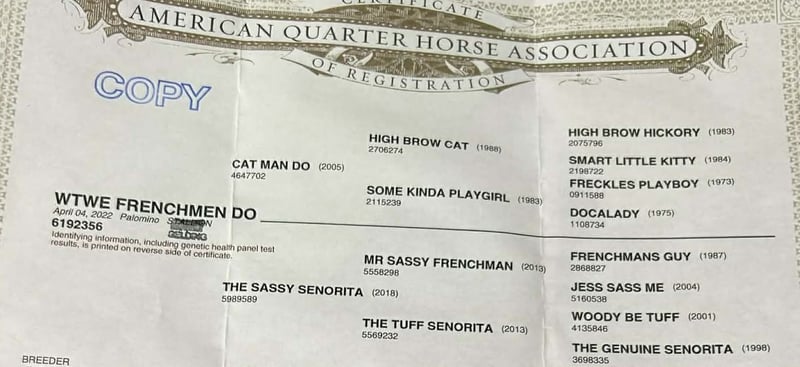 "AVAILABLE ON ONLINE HORSE AUCTION AT www DOT PlatinumEquineAuction DOT com BIDDING OPEN NOW thru SUNDAY | APRIL 19TH! *Final price will be determined on auction site* CONSIGNOR CONTACT INFO: SRM Equine 309-678-7521 LOCATION: Stephenville, TX Buckwheat Man, oh man! It’s our great pleasure to introduce you to WTWE Frenchmen Do, affectionately known around the barn as Buckwheat or even Sweet Buckwheat to some. They don’t come any cuter, flashy, or easy going than Mr Buckwheat! Standing 14 hands even, this guy is the perfect size for both children and adults. His beautiful golden coat and thick, long, white mane and tail make people do double takes EVERYWHERE HE GOES. He is so cute! It’s not just his color that’s catching eyes though. Buckwheat has a sweet little jog and short lope but will also extend when asked. This guy has a beautiful disposition, big hip, soft, kind eye, and a gorgeous head full of brains. That’s the key, right?! His pedigree speaks for itself! As an own son of Cat Man Do and a great grandson of Woody Be Tuff AND Frenchmans Guy, this guy was born to perform! Buckwheat has been such a dream to work with and have in our barn. He’s such an easy horse to be around that it’s easy to get spoiled with him. He stalls well, gets along next to anyone both in stalls and turn out lots, stands tied quiet as a church mouse both at home and out at new places. Vets, baths, saddling, trimming, hauling, none of it is a big deal for Buckwheat. He stands quietly for all of the above as well as loads and unloads easily. Now, let’s get to more of this guys actual resume! Last fall Buckwheat took on a new roll and learned the ins and outs of breakaway roping with Destinee Wofford. In this position his bloodlines really showed up and showed out! He showed us just how quick and athletic he was and impressed many. Staying calm and flat in the box, yet fast and to his spot when asked, Buckwheat showed that he absolutely could have a future in breakaway. Next in his career, Buckwheat learned the barrel pattern. His athleticism really showed here as well, as he picked up on barrels like it was just another day in the office. We love a well rounded horse so most recently Buckwheat has been working on perfecting his fancy handle. He is super easy to ride and has all the buttons one could ask for. Buckwheat stays soft in the bridle, breaks at the pole, picks up his rib cage, pivots on both ends, pretty much any tool you might need, it’s been installed. New environments are no big deal for Buckwheat making him a dream to haul. On the trail he will confidently lead the pack, follow behind, stick in the middle or even ride off by himself if asked. He’s not phased by the tarp, flag, barrels, or any of that odd ball stuff that might be spooky. Buckwheat has been used to pony colts but also doesn’t mind to be ponied himself and does great in both positions. Take the time to watch his video and you’ll get to see just how incredible this guy is. If that doesn’t do it for you, come on out and meet him! We would love to have you! We’re located in Stephenville, Texas. Please give Shelby a call at 309-678-7521 to discuss more about Buckwheat.