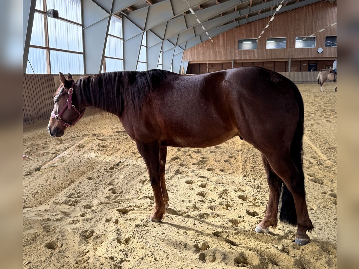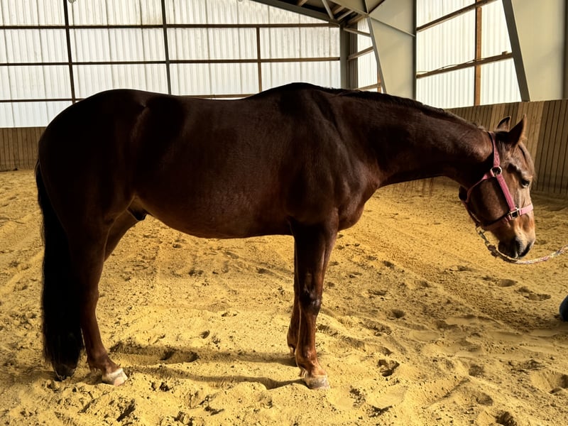 Verkaufe American Quarter Horse Wallach, geb. 2022, in wunderschönem Dunkelfuchs. Mit einem Stockmaß von 146 cm ist er perfekt für den ambitionierten Reining /Ranch Riding oder Freizeit Reiter, der ein junges, vielversprechendes Pferd sucht. Der Wallach wurde mit 3 Jahren gestartet er ist gut geritten und zeigt bereits erste vielversprechende Ansätze für den Sport. Seine solide Grundausbildung sowie sein freundliches Wesen machen ihn zu einem zuverlässigen Partner. Ein echtes Talent, das noch viel Potential für die Zukunft bietet. Bei Interesse stehe ich gerne für weitere Informationen und eine Besichtigung zur Verfügung.