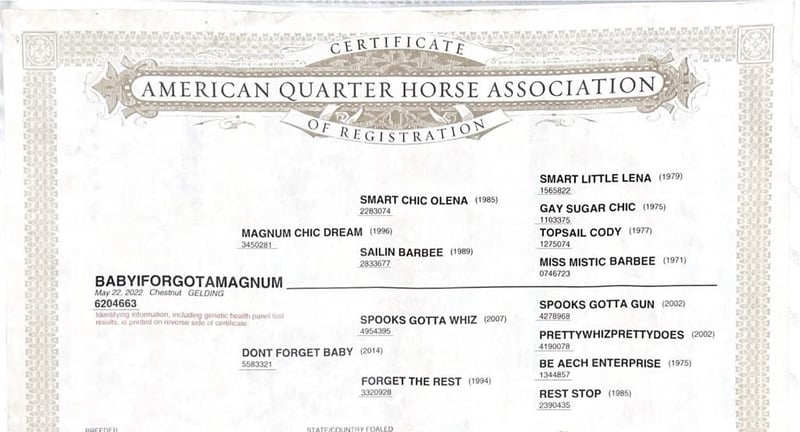 AUKCJA ONLINE Składaj oferty na stronie www.PlatinumEquineAuction.com Stawka początkowa 3500 USD Aukcja kończy się 3 listopada 2024 r. Potrzebujesz nowego siodełka? Sprawdź White Rock Saddles na naszej stronie internetowej lub Facebooku! Przedstawiamy Illustrious Babyiforgotamagnum, pieszczotliwie znanego jako Ricky Bobby - oszałamiającego wałacha modelowego z 2022 roku, który emanuje niezaprzeczalną charyzmą i urokiem odpowiadającym jego niezwykłemu rodowodowi. Spłodzony przez legendarnego Magnum Chic Dream, tytana w świecie reiningu z oszałamiającą kwotą 11 milionów dolarów na koncie, Ricky Bobby pokazuje w sobie dziedzictwo doskonałości, które wykracza poza dyscypliny - od reiningu, reined cow horse po wyścigi beczek i nie tylko. Jego matka, Don't Forget Baby, sama zarabiająca pieniądze i córka wielkiego Spooksa Gotta Whiza - innego ośmiocyfrowego reproduktora - zapewnia, że rodowód Ricky'ego jest nie tylko imponujący, ale także przesiąknięty sukcesem; ten genetyczny gobelin splata razem ponad 500 000 dolarów zarobków z samej linii matki. Zapisany zarówno do programów NRHA, jak i NRBC, uosabia potencjał gotowy do uwolnienia na każdej arenie lub szlaku. Temperament Ricky'ego jest po prostu wysublimowany; posiada usposobienie "urodzonego zepsutego", które stoi twardo przed rozpraszającymi przeszkodami, takimi jak trzepoczące plandeki, odbijające się piłki lub trasy szlaków, co jest świadectwem jego pewności siebie, pielęgnowanej poprzez ekspozycję podczas profesjonalnego treningu pod fachowymi rękami. Z niewymuszoną elegancją odzwierciedloną w jego naturalnie niskim nakryciu głowy i stylu Cadillaca, przypominającym szybowanie w powietrzu, wykonuje potężne zatrzymania ślizgowe w połączeniu z obrotami tak precyzyjnymi, że mogłyby na nowo zdefiniować jeździecki kunszt. Pomimo młodego wieku, wykazuje się wyjątkową reakcją przypominającą doświadczonych mistrzów; jest naprawdę koniem typu "push button", który chętnie zabiega o każdego, kto szuka partnerstwa. Ricky czesze, wiąże, kąpie i stoi dla kowala. Jedną z jego najlepszych cech jest to, że ma złote serce. Spotka cię przy bramie i będzie podążał za tobą jak szczeniak. Nie przegap tego partnera na całe życie! Prosimy o kontakt z Beau Mendala 831-732-9074 Znajduje się w King City, CA. AUKCJA ONLINE Składaj oferty na www.PlatinumEquineAuction.com Cena wywoławcza 3500 dolarów Aukcja kończy się 3 listopada 2024 r. Potrzebujesz nowego siodła? Sprawdź White Rock Saddles na naszej stronie internetowej lub Facebooku!