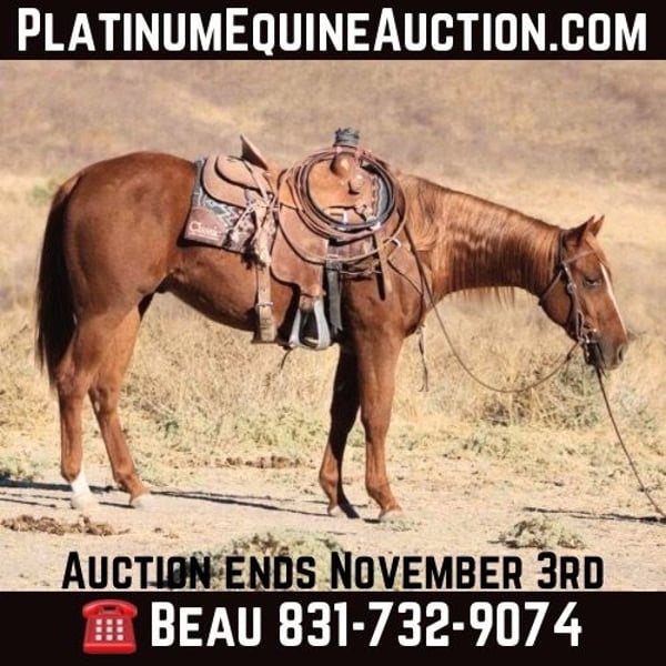 ONLINE AUCTION Place your bids at www.PlatinumEquineAuction.com Starting Bid $3500 Auction ends November 3rd, 2024 Need a new saddle? Check out White Rock Saddles on our website or Facebook! Introducing the Illustrious Babyiforgotamagnum, affectionately known as Ricky Bobby—a stunning 2022 model gelding that exudes an undeniable charisma and charm befitting his remarkable lineage. Sired by the legendary Magnum Chic Dream, a titan in the world of reining with a staggering $11 million to his name, Ricky Bobby shows within him the legacy of excellence that has transcended disciplines—from reining, reined cow horse to barrel racing and beyond. His dam, Don’t Forget Baby, herself a money earner and daughter of the great Spooks Gotta Whiz—another eight-figure sire—ensures that Ricky’s pedigree is not just impressive but also steeped in success; this genetic tapestry weaves together over $500,000 in earnings from his maternal line alone. Enrolled in both NRHA and NRBC programs, he embodies potential ready to be unleashed upon any arena or trail. Ricky’s temperament is nothing short of sublime; possessing a “born broke” disposition that stands firm against distractions like flapping tarps, bouncy balls or trail courses, a testament to his confidence nurtured through exposure during professional training under expert hands. With an effortless elegance reflected in his naturally low headset and Cadillac style lope akin to gliding on air, he delivers powerfully executed sliding stops paired with spins so precise they could redefine equestrian artistry. Despite being youthful at heart, he showcases exceptional responsiveness reminiscent of seasoned champions; he’s truly a “push button” horse who eagerly endeavors for anyone seeking partnership. Ricky clips, ties, bathes, and stands for the farrier. One of his best qualities is that he has a heart of gold. He will meet you at the gate, and follow you around like a puppy dog. Don’t miss out on this partner of a lifetime! Please contact Beau Mendala 831-732-9074 Located in King City, CA. ONLINE AUCTION Place your bids at www.PlatinumEquineAuction.com Starting Bid $3500 Auction ends November 3rd, 2024 Need a new saddle? Check out White Rock Saddles on our website or Facebook!