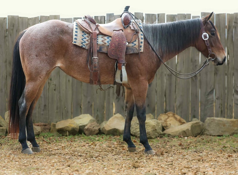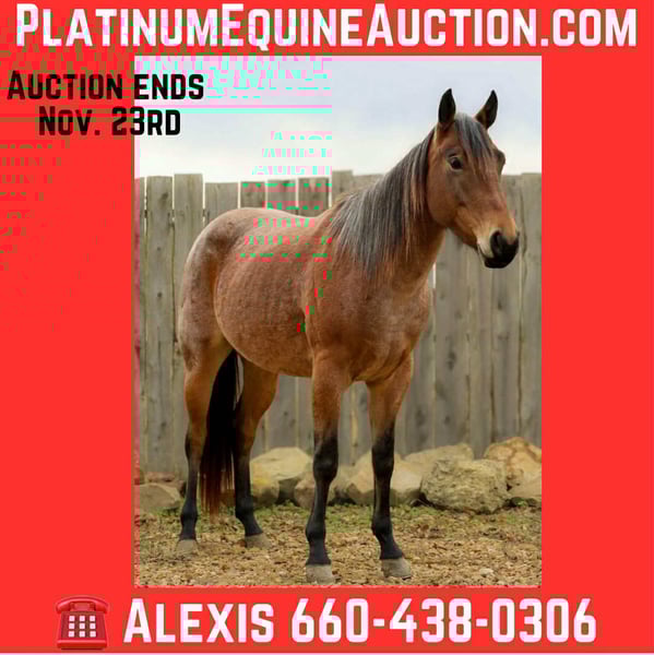ONLINE AUCTION Place your bids at www.PlatinumEquineAuction.com Starting Bid $3500 Auction ends November 23rd, 2025 Need a new saddle? Check out White Rock Saddles on our website or Facebook Sweet Rose may be young in years, but she carries the calm, wise soul of an old veteran. From the start, she’s been the picture of patience — slow, kind, and forgiving in every situation. Always the first to meet you at the gate, Rose is the kind you can pull out after months off, throw the kids on, and trust she’ll take care of them every single time. She’s seen it all and handles everything with quiet confidence — from working the sale barn and gathering outside to tackling trail obstacle courses and leisurely trail rides. Nothing seems to bother her, and she always gives her rider her full attention and trust. Rose rides around beautifully — soft in the face, responsive, and even goes without a bridle. She’s the definition of broke and dependable. Whether you’re looking for a solid partner to get a job done, a gentle mount for the kids, or a family favorite everyone can enjoy, Rose is that once-in-a-lifetime mare who checks every box. This bay roan beauty isn’t just a horse — she’s the heart of the barn and the one everyone wants to ride. She’s a 2022 model, around 14:2HH, we’ve had this mare a while but we never sent in her papers so she’s just on application. For more info contact Alexis with AM Equine 660-438-0306 Located in Cole Camp, MO. ONLINE AUCTION Place your bids at www.PlatinumEquineAuction.com Starting Bid $3500 Auction ends November 23rd, 2025 Need a new saddle? Check out White Rock Saddles on our website or Facebook