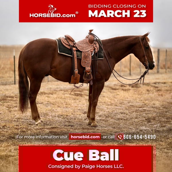 ⚜️𝓽𝓱𝓮 𝐆𝐎𝐋𝐃 𝓢𝓮𝓵𝓮𝓬𝓽⚜️ Happening now thru MONDAY | MARCH 23rd - Available EXCLUSIVELY on HorseBid's website! For more details and to register visit: www.Horsebid.com . CONSIGNOR CONTACT: Paige Horses LLC. 806-654-5490 LOCATION: Amarillo, TX BREED: Quarter Horse REGISTERED: Yes REGISTERED NAME: MVP IN CUE COLOR: Sorrel HEIGHT: 14.3 AGE: 4 GENDER: Gelding Here’s the kind everybody goes looking for, but rarely find. Meet Cue Ball, a 2022 AQHA Registered Sorrel Gelding sired by the one and only- METALLICS MVP NCHA Open World Champion LTE $345,159 and out of an own daughter of QUEJANAISALENA-NCHA LTE $338,204. Cue Ball is ALL that and then some. Cowy, athletic, gentle, kind hearted, soft eyed, and talented! Cue started his riding career in a cutting program where he acquired all the mechanics/maneuvers on a cow and my goodness, did he pick up the right stuff. After that, he got some training in the Ranch Riding discipline where he learned body control, cadence, and timing. Since then, we have used Cue in our preconditioning feedyard and lightly started pen roping off of him. Wrap that all up and you’ve got a ‘Jack of all trades’ type of gelding. He’s a top notch prospect to take the rope horse route, but if you have no desire or interest in a rope horse, pick a discipline out of a hat, Cue Ball has potential in whatever is wrote down on that piece of paper. We can’t brag enough about this geldings’ mind. He has NEVER told us “no”, got mad, or been ill about anything we’ve asked of him. He’s got all the run, stop, stride, cowsense, and disposition you could ever ask for one to have. We’ve loaded trucks on him, sorted, pulled sick cattle, gathered yearlings off wheat, whatever we’ve asked him to help us do, he’s done it on a loose rein, low headed, and efficiently every time. Cue Ball travels extremely smooth, has beautiful fluid transitions, and stays gentle no matter the time off. You can wind him up, call on him, ask him for his life, and the second you put your hand down…he shuts off like running water. Cue Ball stands 14.3 and weighs a full 1250 lbs. He’s got shape, substance, big bone, plenty of foot, and a head that could fit in a shoe box. We would love to visit with you about Cue Ball, for more information call or text Taylor at 806-654-5490 or to schedule a time to come try him. Located in Amarillo, Tx. We can help arrange shipping and will provide 5 days free board/care while those arrangements are made, if necessary. PPE’s gladly welcomed at potential buyers expense. Sells 100% sound in every way. Cue Ball is straight and correct and there’s not a hair out of place on him. Take advantage of this opportunity, these kind rarely change hands. METALLICS MVP OFFSPRING ELIGIBILITIES INCLUDE- Riata Buckle Gold Buckle Futurities Royal Crown Roping SOLO Select- Rope Horse Breeders Invitational NRCHA Cowhorse Incentive And the list goes on…