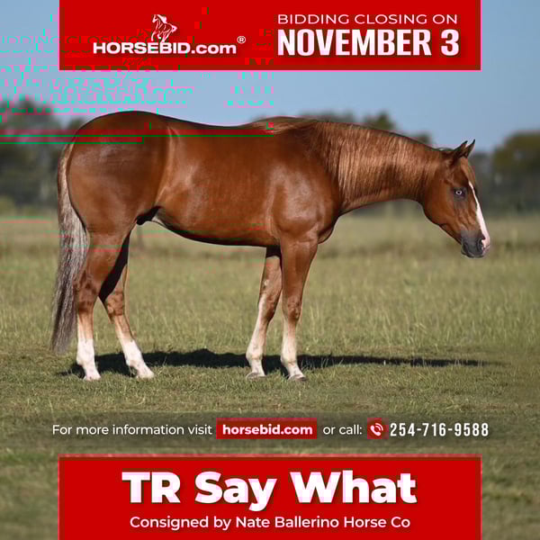 ⚜️𝐓𝐇𝐄 𝐅𝐀𝐋𝐋 𝐇𝐄𝐑𝐈𝐓𝐀𝐆𝐄 𝐂𝐋𝐀𝐒𝐒𝐈𝐂⚜️ Happening now thru MONDAY | NOVEMBER 3rd - Available EXCLUSIVELY on HorseBid's website! For more details and to register visit: www.Horsebid.com CONSIGNOR CONTACT: Nate Ballerino Horse Co (254) 716-9588 LOCATION: Waco TX BREED: Quarter Horse REGISTERED: Yes REGISTERED NAME: TR SAY WHAT COLOR: Sorrel HEIGHT: 14.3 AGE: 3 GENDER: Gelding 🔥 3-Year-Old Gelding by Colonel Shining Gun (LTE: $115,000) x Topsail Whiz Mare (LTE: $103,834, Dam of $330,664+ Earners)🔥 This colt has the kind of pedigree and start that set him apart. Sired by Colonel Shining Gun (LTE: $115,000) and out of a proven Topsail Whiz mare, earner of $103,834 and producer of over $330,000+, he’s bred to perform at the highest level. This gelding has spent nearly a year in a professional training program and is right on track to show. He’s solid in all his maneuvers — stops big, turns correct, changes leads, departs soft, and stays framed up and willing every ride. With his incredible bloodlines, trainability, and natural ability, he shows serious potential as both a reining and rope horse prospect.