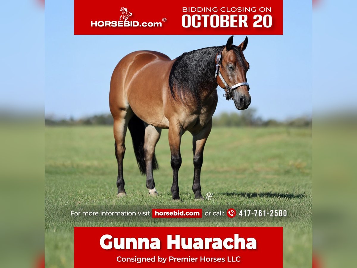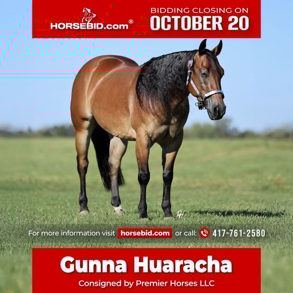 ♦️ 𝐭𝐡𝐞 𝐀𝐌𝐄𝐑𝐈𝐂𝐀𝐍 𝓕𝓪𝓵𝓵 𝓒𝓵𝓪𝓼𝓼𝓲𝓬 ♦️ Happening now thru MONDAY | OCTOBER 20th - Available EXCLUSIVELY on HorseBid's website! For more details and to register visit: www.Horsebid.com CONSIGNOR CONTACT: Premier Horses LLC 417-761-2580 LOCATION: Buffalo, MO BREED: Quarter Horse REGISTERED: Yes REGISTERED NAME: Gunna Huaracha COLOR: Bay HEIGHT: 14.3 AGE: 3 GENDER: Gelding Talk about an absolute show stopper of a gelding, your jaw hits the floor when you look at Gunna Huaracha. He is going to stop people in their tracks, no matter where you take him. Creed is sired by the great $16 million dollar sire, Gunnatrashya, who needs no introduction. His dam, Superior Vintage, is by $4.2 million dollar sire A Sparkling Vintage. Multi million dollar sires on both sides of his papers, it doesn’t get much better than that. Oh wait, but it does get better because he came from a fantastic program and has the look. Creed is the prettiest bay color and has a jet black mane that goes to his shoulder along long thick tail to match. He is thick made with a huge hip, nice shoulder, and a baby doll head to tie him together perfectly. Creed was in training at Cira Baeck’s program for a year, he definitely has the best start and foundation you would want on one. He has strong spins, huge stops, circles easy with a pretty slowdown, and lead changes. Creed has all the potential to hit the show pen with more training. He is very user friendly to ride and will make you smile the whole ride. Our 6 year old daughter has a blast riding him, bouncing the yoga ball and riding him bareback. Creed does all the fancy maneuvers and has the look, but he also rides down the trails like an old professional. He crosses creeks, goes up and down embankments, and go check the mail on him. Creed goes across bridges and obstacles, you can also go move cattle on him. He is as versatile as a gelding that you could ever want. Creed has the biggest personality and loves to be around people. Do not take this opportunity for granted, he will always put a smile on your face!