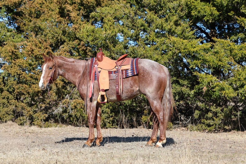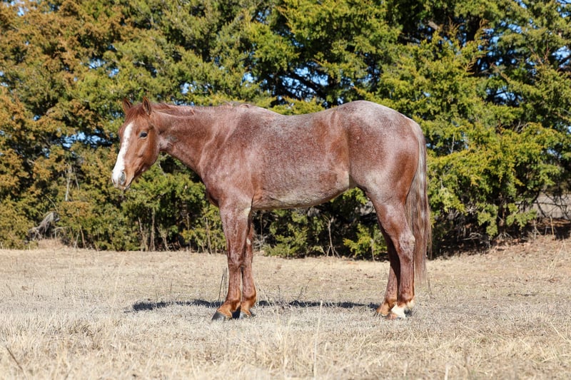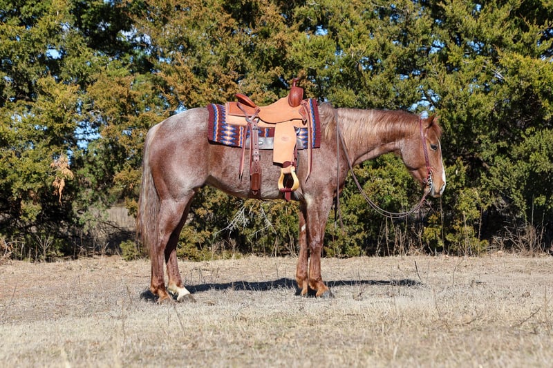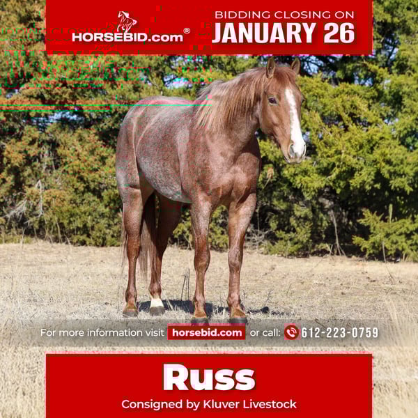 𝐉𝐀𝐍𝐔𝐀𝐑𝐘 ⭐️𝑨𝒍𝒍 𝑺𝒕𝒂𝒓 𝑳𝒊𝒏𝒆𝒖𝒑⭐️ Happening now thru MONDAY | JANUARY 26th - Available EXCLUSIVELY on HorseBid's website! For more details and to register visit: www.Horsebid.com CONSIGNOR CONTACT: Kluver Livestock 612-223-0759 LOCATION: Ripley, OK BREED: AQHA REGISTERED: Yes REGISTERED NAME: FANCY STEPPIN METAL COLOR: Red Roan HEIGHT: 14.3 AGE: 4 GENDER: Gelding Russ is a puppy dog gentle 4 year old with a huge heart and the grit to get down and dirty when the job calls for it. This stunning red roan gelding is the total package! Eye catching looks, correct conformation, and a pedigree that packs a punch. He’s the kind that meets you at the gate and wants to be with you. Despite his age, Russ rides just as good, if not better than many seasoned, old broke horses, and he gives his rider a level of confidence that’s hard to find in one this young. Russ is exceptionally broke and incredibly handy. He rides willingly and correctly in your hand with a soft face and a responsive body. He has a phenomenal stop, turns around on a dime, neck reins with ease, and lopes smooth collected circles on a loose rein or completely bridleless. He’s quiet, honest, and consistent every ride, with all the buttons installed and a rock-solid foundation underneath him. This is the kind of horse that makes a rider better and allows you to focus on enjoying the ride rather than managing the horse. Russ has been ridden through town and is safe and dependable around traffic, equipment, and dogs. He’s level-headed, unfazed by his surroundings, and handles new situations with calmness. Started on the flag from day one, he took to it naturally and showed immediate feel, and instinct. He’s already been used for sorting and will hunt one down with ease. He has been roped off of many times, started on the breakaway, branded calves, and doctored wheat cattle. Has had professional cow horse training and has also had a taste of the barrel pattern and took to it with ease. He is extremely cowy, athletic, and confident, with the grit and desire to do his job right every time. Russ is a rare kind, one that’s broke enough for a wide range of riders yet talented enough to go be competitive in the performance arena. Whether your goals are ranch work, cow horse events, roping, barrel racing, or taking him in an entirely different direction, he has the versatility, work ethic, and ability to absolutely excel. This is a young gelding with a big future, a finished feel, and the kind of mind and talent that’s hard to replace! ✔️Stands tied ✔️Loads ✔️Good for farrier/vet ✔️Bathes