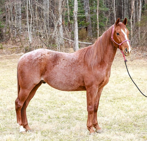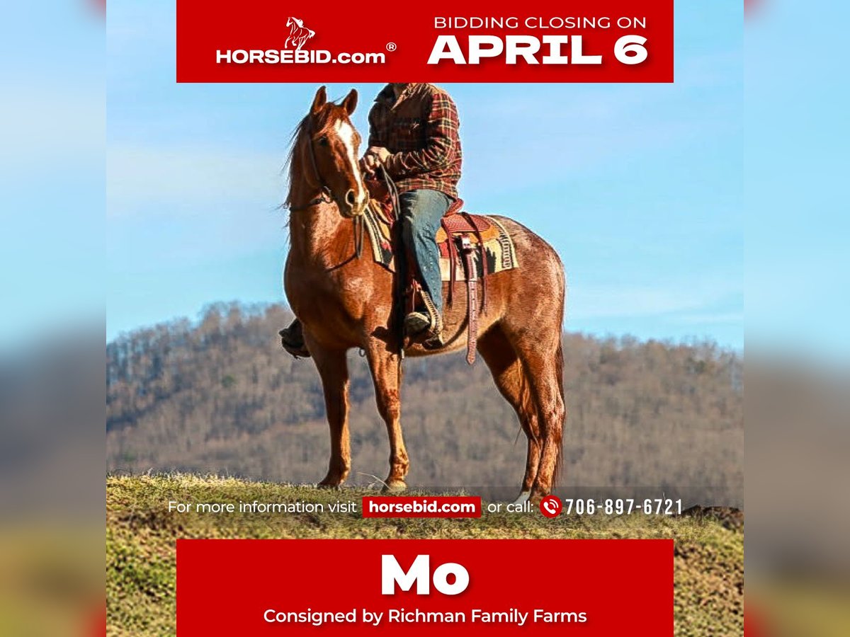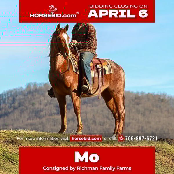 🌟𝑨𝒑𝒓𝒊𝒍 𝐀𝐋𝐋 𝐒𝐓𝐀𝐑 𝐋𝐈𝐍𝐄𝐔𝐏🌟 Happening now thru MONDAY | APRIL 6th - Available EXCLUSIVELY on HorseBid's website! For more details and to register visit: www.Horsebid.com CONSIGNOR CONTACT: Richman Family Farms 706-897-6721 LOCATION: Blairsville, GA BREED: QH REGISTERED: Yes REGISTERED NAME: Lil Mo Enterprise COLOR: Red roan HEIGHT: 14.3 AGE: 4 GENDER: Gelding Lil Mo a 4yr old Registered Red Roan AQHA Gelding. Mo has the breeding and the moves to be an exceptional athlete. He has a very good one handed neck rein, moves off leg pressure, and is super soft in the bridle. He will take both leads with ease in the arena. Mo is very gentle to be around and very easy to get along with. He has been ridden in the North GA mountains for the last 6-7 months. We have trail ridden him all over our farm, as much as we have literally took him to town and rode all over. I’ve used him pushing cattle around and checking fences. He’s been nothing shy of a gentleman since he has been with me and my family. He is always there at the gate waiting on us to start the day. I swear he is more dog than horse. Mo will W/T/C or just lope right out of his tracks from a dead standstill. He will cross tie in our wash-rack to bathe him. Mo stands great for the farrier as well as he does to be mounted. He sales UTD shots, shoes, coggins, and deworming. I can help with transportation as well. Feel free to call anytime if you have any questions. 706/897/6721