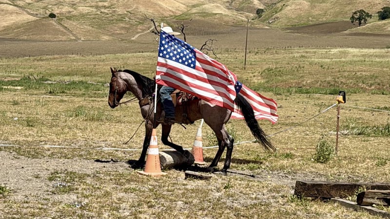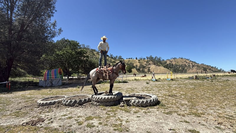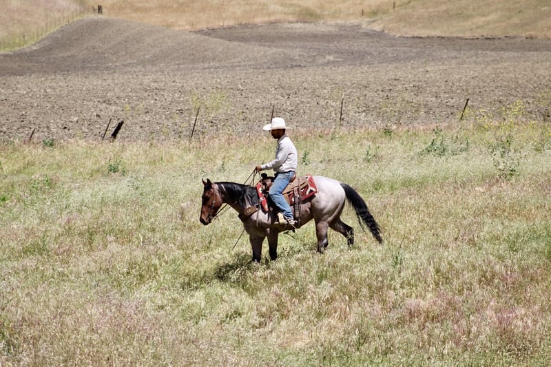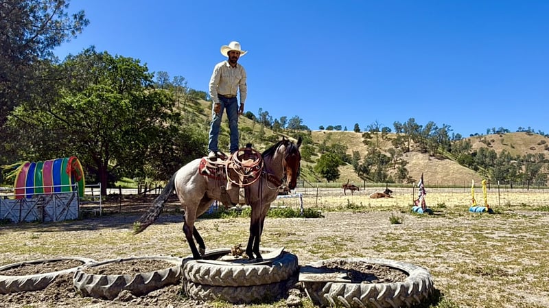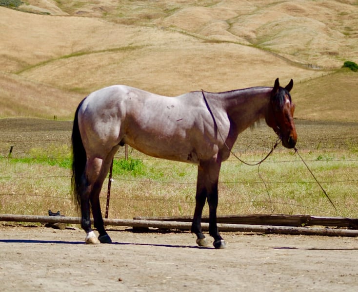"AVAILABLE ON ONLINE HORSE AUCTION AT www DOT PlatinumEquineAuction DOT com BIDDING OPEN NOW thru SUNDAY | APRIL 26TH! *Final price will be determined on auction site* CONSIGNOR CONTACT INFO: Longhorn Ranch 831-537-1915 LOCATION: Paicines, CA 2 STEP “Catch the rhythm… this one doesn’t miss a beat.” 4-Year-Old Roan Gelding 15 hands There are horses you like… and then there are the ones you remember. 2 Step is the kind that leaves an impression long after you’ve stepped off him. With his eye-catching roan color and natural presence, he turns heads everywhere he goes—but it’s what’s underneath that really makes him special. At just 4 years old, he carries the mind, feel, and ability of a horse well beyond his years. The kind that makes you double take when you realize how easy he is. Step on him and everything just feels right. He’s one-hand broke, soft in the bridle, and correct in his movement. He lopes off quiet, stays collected, and moves with a smooth, easy feel that makes him a pleasure to ride. He uses his hind end the way one should, has a nice stop, and a clean, balanced turnaround that fits his natural style. This is the kind of horse that makes a rider look good without asking for much in return. We’ve put him to use and enjoyed him everywhere. Out on the trail, he’s as steady as they come. He’ll cross water, step over logs, handle steep terrain, and travel through rough country without hesitation. Wildlife, commotion, or new places don’t shake him—he stays level-headed and willing wherever you point him. Obstacles are no big deal either. Flags, tarps, balls dragging behind him—he handles it all with the kind of quiet confidence that’s hard to teach. He’s been around cattle, enjoys then and has been roping the lead steer as well as working slow cattle. He’s a handy ranch partner that’s ready to go to work when asked, but just as happy to take you on a quiet ride. And when the work is done, he’s the first one to meet you at the gate. 2 Step has that friendly, kind, “puppy dog” personality everyone hopes for. Easy to catch, easy to be around, and the same good-minded horse every single day. He’s safe to tack up, stands quiet, hauls well, and settles into a stall or pasture with no fuss. Ride him down the road through traffic, around town, or out in the open—he handles it all like it’s part of his everyday routine. He’s the kind that feels like he was born knowing his job. Horses like this—young, talented, level-headed, and this easy to get along with—don’t come around often. If you’ve been waiting for one that’s got the looks, the mind, and the ability to go in any direction… 2 Step is ready to be your partner for the long haul. Dina at Longhorn Ranch 831:537:1915 Paicines, Ca Shipping available nationwide with reputable haulers Come see him in person or schedule a FaceTime—we’d love to show him to you