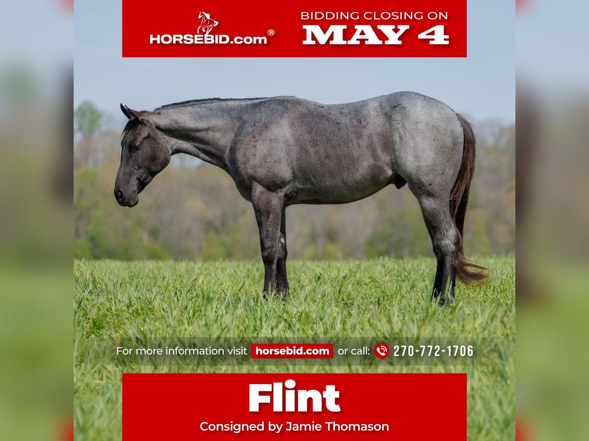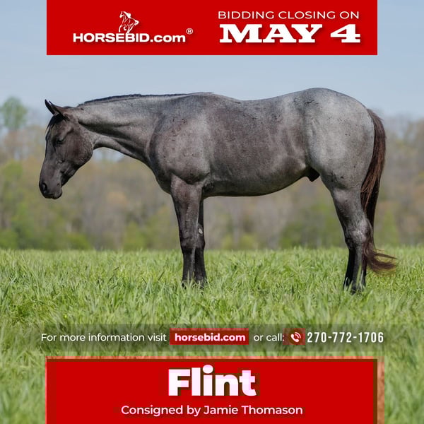 ▪️▫️◾️𝐭𝐡𝐞 𝑴𝒂𝒚 𝐒𝐞𝐥𝐞𝐜𝐭◾️▫️▪️ Happening now thru MONDAY | MAY 4th - Available EXCLUSIVELY on HorseBid's website! For more details and to register visit: www.Horsebid.com CONSIGNOR CONTACT: Jamie Thomason 270-772-1706 LOCATION: Auburn, KY BREED: AQHA REGISTERED: Yes REGISTERED NAME: GENUINE WYO BLUE COLOR: Blue Roan HEIGHT: 15 AGE: 4 GENDER: Gelding The calm, quiet partner anyone can enjoy, this one checks all the boxes. Well trained and naturally versatile, uncomplicated and forgiving. A family favorite! Flint is a 4yr old, true blue roan, AQHA gelding standing 15 hands. Whether he’s cruising across open pastures, riding through town, or relaxing at home, Flint stays the same honest, reliable horse every time you swing a leg over. He doesn’t require a consistent program to stay solid, and he comes back the same even with time off. Flint is gentle and trustworthy around children, happily providing walk, trot, and lope rides in the arena. He travels both directions on the correct lead on a loose rein, moves laterally, and has an uncomplicated handle. He has a comfortable trot and a smooth, slow canter, enjoyable to ride. Flint has taken everything we’ve put in front of him with ease. He’s confident popping over cross rails, gathering cattle, and tackling obstacles. Flint is backed by real-world experience. His life hasn’t been solely spent inside an arena. He’s confident on the trail both alone & in a group. Never picks up the pace unless asked. Crosses water, downfall, goes up & down inclines, and navigates various terrain with ease. We’ve rode him in to town, he's unbothered by traffic. We’ve gathered cattle alongside stock dogs. He’s a true unload and ride anywhere style. Flint is a pleasure to have at home. He keeps an immaculate stall, but is as equally content living outside. Pastures both alone & with others. He’s always easy to catch. Very personable, enjoys grooming, stands tied, cross tied, and for bathing. He’s easy to load & haul. Does well for the vet & farrier. Flint is the kind that quickly becomes part of the family. A true all-around companion, he’s not just a horse you ride, he’s a partner and a friend for a lifetime. Flint sells current on all cares. We can assist with transportation to anywhere! If you would like to meet Flint prior to adding him to your family or have any additional questions, feel free to reach out!