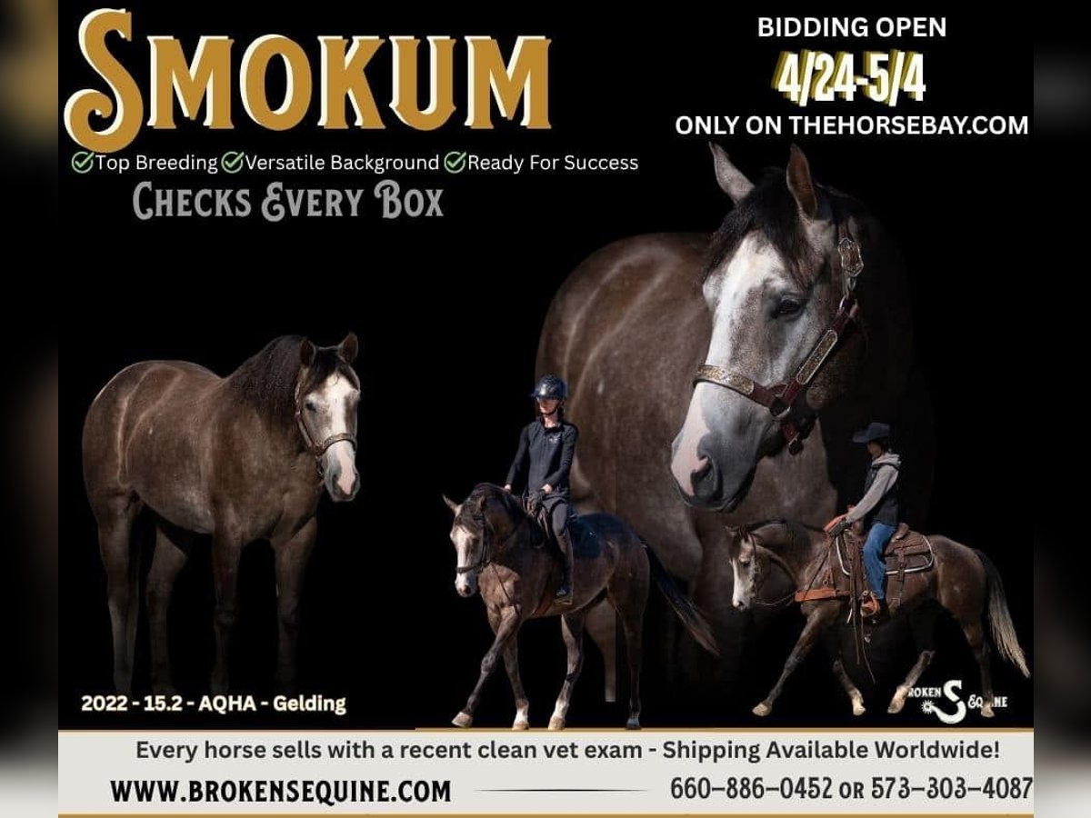 Smokums Gunn “Smokum” is a 2022 Quarter Horse Gelding standing 15.2 hands tall. Everything about this horse sets him up for success. From his breeding to his foundation, and every experience and job he has had along the way. Talk about a versatile horse, Smokum has an impressive resume to go along with his good looks and mind. Smokum was started in a cow horse program, worked in the feedlot, has been exposed to all aspects of ranch work, puts together a beautiful dressage test, and will jump a small course of fences in the ring. Smart, versatile, horses are what we aim for, and Smokum certainly checks that box and then some. Whether you want to excel in the arena, the show ring, or on the ranch, Smokum is ready and prepared for any job. Under western tack, Smokum has smooth lead departures, circles well, has a great turnaround and a big stop. He rides one handed with a great handle to him. He is ready to succeed in the ranch versatility classes. He has a ton of cow and loves to have a job. Under English tack, Smokum is soft in the bridle and likes to be round and correct. He is extremely smooth and comfortable with easy transitions and adjustability. He’s the right mix of whoa and go, having the athletic ability there when you need it without being a hot or forward ride. He has been coursing 2’ with scope for more and has been honest and simple over fences. Though he is very sensible and has been amateur friendly in our program, due to his age and buttons his training gives him, we feel Smokum is not for a complete beginner unless they plan to keep him in a program with a trainer to help along the way. If you have any questions or concerns for his suitability for you, give us a call and we are happy to help figure out if he’s the one or if another one of our horses may be better for you. On the ranch and in the feedlot, Smokum has plenty of miles and experience. He’ll open and close gates all day long, he’s been used for early morning shipping, fun to sort on, and will work as long as you ask him to. On the trails, Smokum is happy to go out on a loose rein and enjoy the sights. He has seen freight trains, tractor trailers, buggy’s, and everything in between. He’ll cross bridges, loves the water, and will ride through town right down Main Street. In the barn, Smokum is like a puppy dog. He loves people and attention and is a good boy for all the usual barn tasks. He’s easy to catch in the field and enjoys living outside. He is an easy keeper that is a useful horse to have around. ⚫️Smokum is an easy keeper that requires no maintenance.