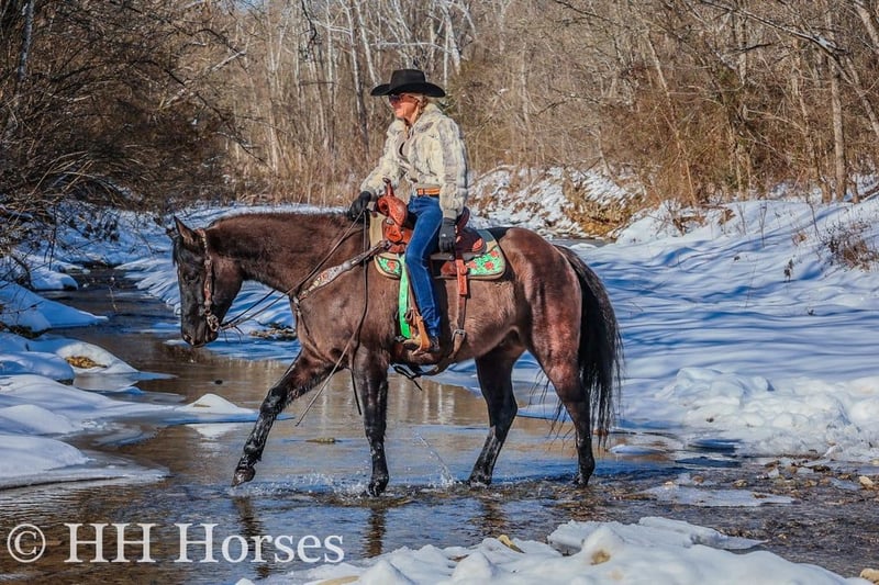 ONLINE AUCTION Place your bids at www.PlatinumEquineAuction.com Starting Bid $3500 Auction ends January 26th, 2025 Need a new saddle? Check out White Rock Saddles on our website or Facebook! This is “ICE CHARLIE KISS LEO”, a gorgeous registered 2021 AQHA BLUE GRULLA GELDING that is gentle and quiet natured. This gelding is stout made, muscular, and stands 15.3 hands tall. He is coming 4 years old in April. This gelding has been ridden in the indoor and outdoor arenas. He will lope nice circles, stop easily on whoa, and he backs up. He also has been ridden outside on the trails and in the mountains. He is very well mannered and easy going. He has been through the deep water, on rough terrain, and ridden on snow and ice. He is sure footed, travels cautiously down steep embankments, and does not go any faster than you ask of him. He rides out alone courageously and will cross rushing water without hesitation. He is not spooky and fine with wildlife such a deer and turkey jumping out on the trails. He has also been on the road and is traffic safe. He has been around the skid steer in the barn and the side by sides. He will walk relaxed on a loose rein and is not nervous. He has excellent ground manners, stands tied, loads, bathes, and hauls with no issues. He is a super nice young gelding with the color, the look, the brains, and the athletic ability to go do whatever you want to do with him. He has an excellent foundation of training and is ready to go on with his new owners. He is the hard to find kind. For more info or to make a Buy It Now offer contact HH Horses Erin 304-238-4155 Located in Flemingsburg, KY