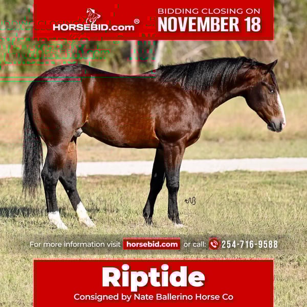 ♦️ THE RIDER'S CHOICE ♦️ Happening now thru MONDAY | NOVEMBER 18th - Available EXCLUSIVELY on HorseBid's website! For more details and to register visit: www.Horsebid.com CONSIGNOR CONTACT: Nate Ballerino Horse Co 254-716-9588 LOCATION: Waco BREED: QH REGISTERED: Yes REGISTERED NAME: Gotta Little Spark COLOR: Bay HEIGHT: 14.3 AGE: 2 GENDER: Gelding Gotta Little Spark aka Riptide is a Double registered 14.3 hand bay gelding with all the shape and bone you could ask for. He is sired by Spooks Gotta Spark who won over 280 k NRHA and out of a daughter of Wimpys Little Step. Rip tide spent 7 months in a reining program and is ready for his career path of your choice. He takes both his leads, spins both ways and has a big Sliding stop. We have pen roped on his and he stays on the quiet side. Please call Nate Ballerino at 254-716-9588 with any questions. Nation Wide shipping can be arranged.
