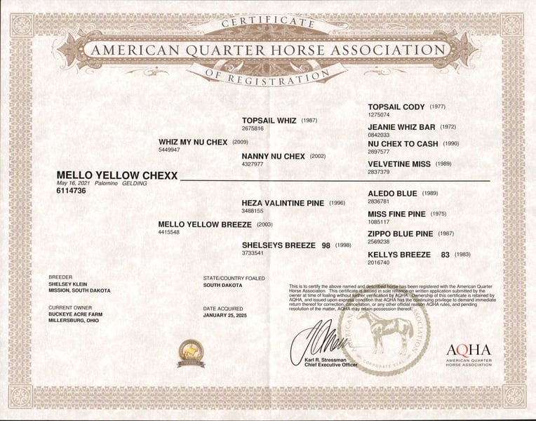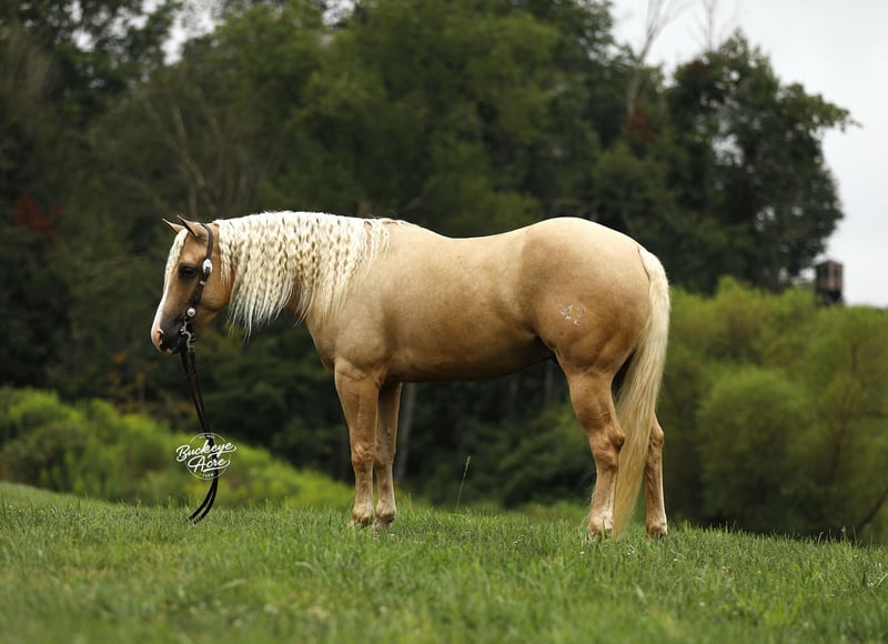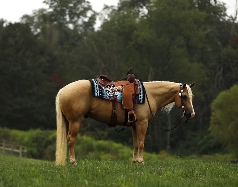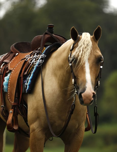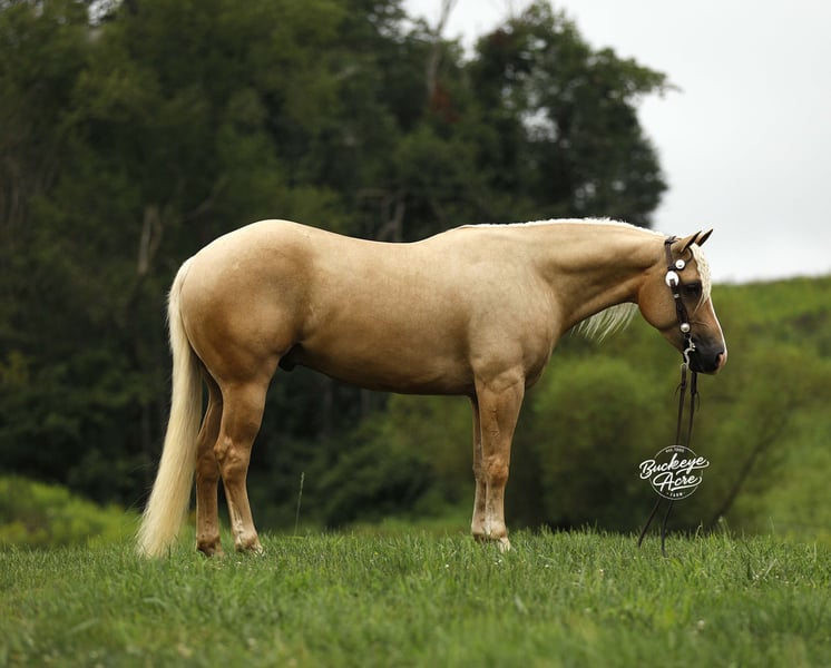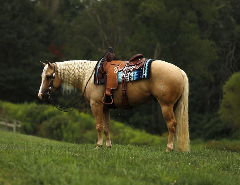 Looking for a horse that turns heads wherever he goes? Meet Monty, a stunning golden palomino gelding with looks, talent, and heart to match. This 2021 model AQHA standing a strong 14.2 hands and is the perfect combination of beauty, balance, and confirmation. Monty is a direct son of Whiz My Nu Chex, a grandson of Hall of Fame and $12 million sire Topsail Whiz, with bloodlines tracing back to the legendary Nu Chex to Cash—an elite pedigree built for performance, versatility, and attention. His bright blaze, expressive eyes, and refined head make him a horse that people notice immediately, but it is his personality that keeps their attention. Monty has proven himself on miles of trails, both alone and with groups, confidently crossing water, stepping over logs, and navigating hills with ease. He has competed in a ranch hand competition as well as a trail course, showing his willingness to work and steady mind in different environments. been used to check cows, horses, and fence lines, and has even been roped off of. Our kids have ridden him on the farm, and we have ponied other horses on him, showing that he is gentle, steady, and safe for riders of all levels. In the arena, Monty is soft, responsive, and exceptionally well-trained. He has a good one-hand neck rein, knows his leads, executes a correct lead change, spins accurately, and side passes, including to the mounting block for easy mounting. He has been ridden Western, English, bareback, and even bridle less, and his gaits are incredibly smooth—from walk, trot, extended trot, to lope—with excellent transitions. Monty responds willingly to cues, making him a pleasure to ride for beginners and experienced riders alike. Monty is versatile beyond riding. He is easy-going and does not need to be ridden every day to stay the same. He is first to greet you at the gate, calm and cooperative in the barn, wash bay, and with the farrier, and he absolutely loves attention and scratches behind the ears. He is desensitized to tarps, jugs, whips, and gunfire, and is traffic safe on state roads. Whether your goal is showing, trail riding, ranch work, or simply having a horse that brings a smile to your face every time you see him, Monty is a horse that does it all. With his perfect combination of pedigree, training, temperament, and eye-catching presence, he is truly one-of-a-kind. If this sounds like the horse you have been looking for, please feel free to reach out to Duane @ 330-231-2324 for more information or to schedule a day to see him in person.